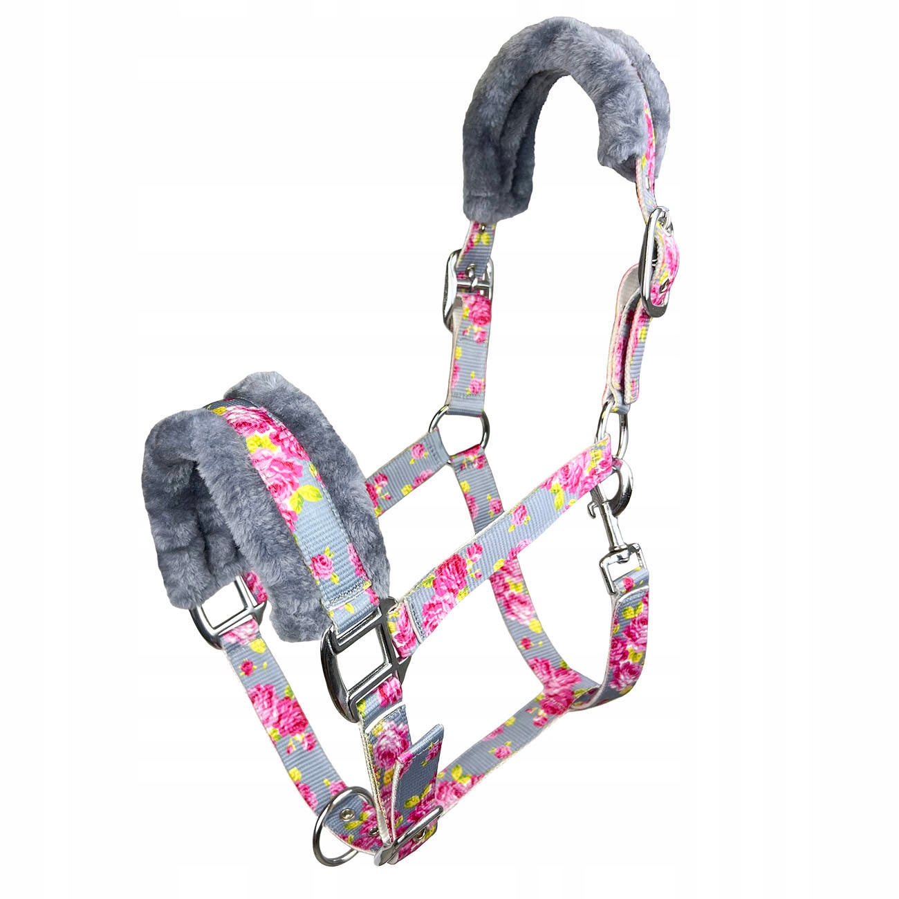 Його яскравий квітковий візерунок ідеально контрастує з сірим хутром. Двостороннє регулювання потиличного ременя дозволяє оптимально підігнати недоуздок до коня.