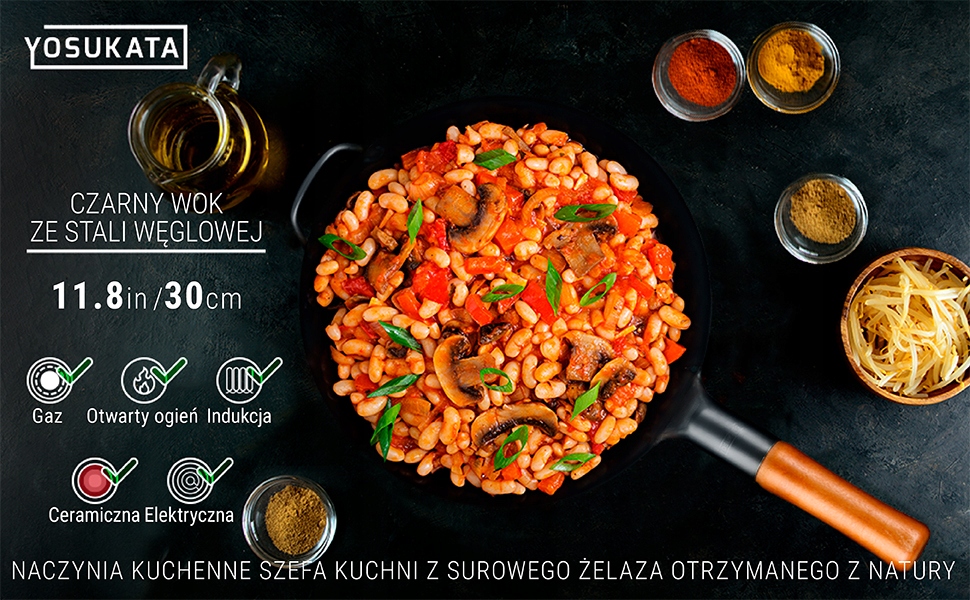 З плоским дном, для смаження та гриля. Вок YOSUKATA з високоякісної вуглецевої сталі - ідеальний вибір для любителів азіатської кухні і техніки стір-фрай. Завдяки плоскому дну вок ідеально працює на всіх типах плит - індукційних, електричних і газових, а також з відкритим вогнем. Він рівномірно розподіляє тепло, забезпечуючи швидке та здорове смаження. Це традиційний китайський вок у сучасному стилі - легкий, міцний і стійкий до високих температур, ідеальний для смаження, смаження та тушкування їжі.