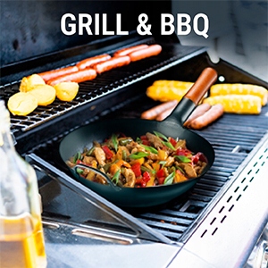 Наш вок з чорної вуглецевої сталі був попередньо приправлений при температурах вище 315°C, що гарантує природне довготривале захисне покриття. Щоб досягти повної стійкості до прилипання, достатньо додатково приправити олією - як і традиційні сталеві воки. Виготовлений з високоякісної сталі 16 калібру з ергономічною дерев'яною ручкою забезпечує комфорт і безпеку приготування.
