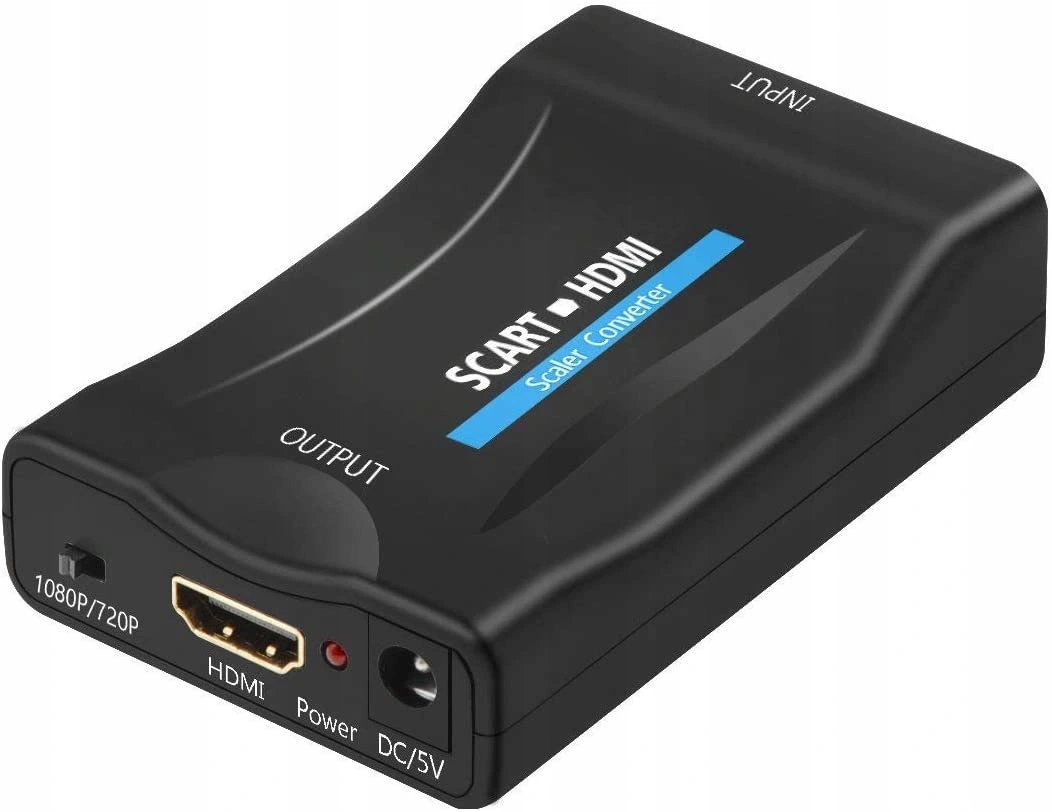 SCART INPUT, HDMI OUT – перетворювач SCART-HDMI дозволяє перетворювати аналоговий сигнал (зображення та звук) від старих пристроїв із входом SCART до цифрового сигналу до пристроїв із входом HDMI (ресівери з входом HDMI). ЗМІНИТИ РОЗДІЛЬНІСТЬ – Аналогово-цифровий адаптер має можливість змінювати роздільну здатність від 720p до 1080p.