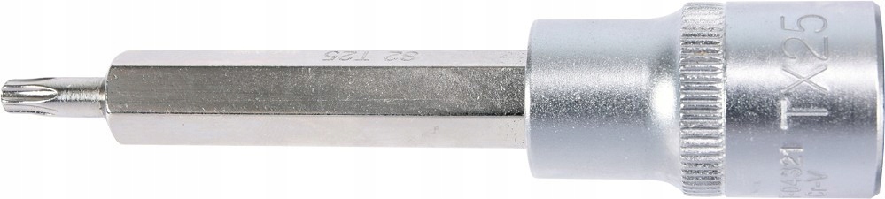 Професійний торцевий ключ TORX, розмір торця 1/2", розмір хвостовика T25. Хромована головка зі сталі CrV6150, хвостовик зі сталі AISI S2 і нікельований. Незамінний інструмент в автомобільній або механічній майстерні.