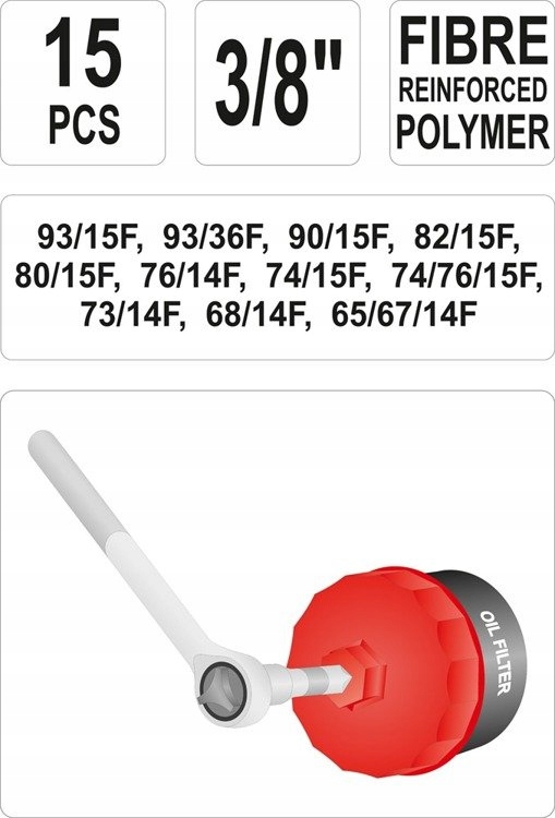 Пропозиція Yato включає професійний набір торцевих ключів для масляних фільтрів. Їх можна використовувати для відкручування фільтрів в легкових автомобілях і мікроавтобусах. Виготовлений із легованої сталі CrMo SCM440, розетка з поперечними ребрами, привід 3/8 дюйма.
