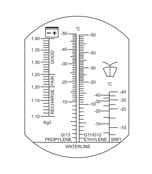 Якщо перевіряється електроліт батареї, показання слід брати на шкалі, позначеній символом батареї. Результат наводиться в кг/л, а шкала додатково описується рівнем заряду акумулятора. Якщо межа потрапляє в область, описану як «ДОБРЕ», це означає, що акумулятор не потребує зарядки; «FAIR» – зарядка поки не потрібна, але може знадобитися незабаром; «RECHARGE» – потрібно зарядити акумулятор.