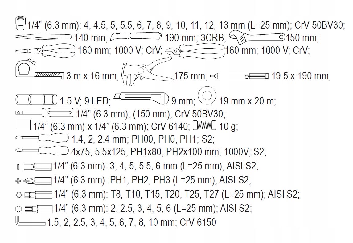 Професійний набір інструментів для електриків. Містить 68 спеціально підібраних інструментів. Це чудова пропозиція як для електромонтажу, так і для автомобільної промисловості. Плоскогубці та викрутки в наборі мають ручки з ізоляцією VDE до 1000 В.