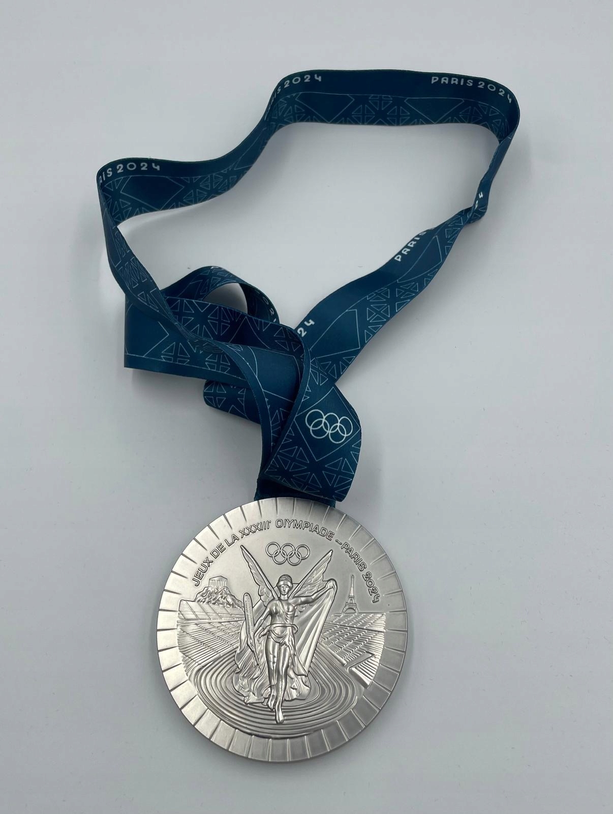 Предмет продажу - копія срібної олімпійської медалі з Парижа, символ боротьби за мрії, стійкості та незвичайної сили характеру. Це сувенір, який нагадує нам про моменти, сповнені емоцій і гордості, – моменти, коли весь світ затамував подих, а спортсмени вписують свої імена в історію.