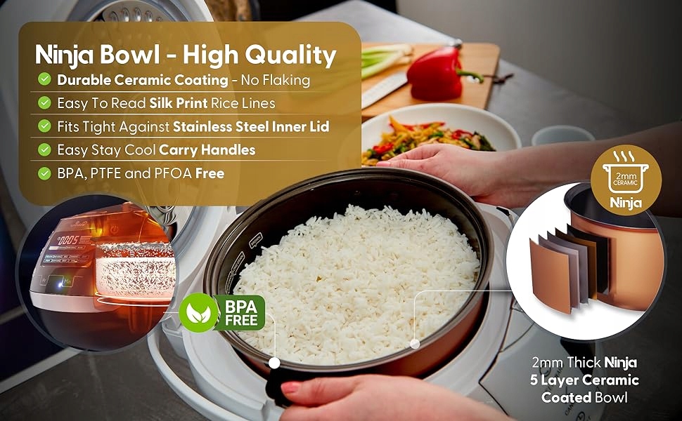 - Високоякісна внутрішня миска з 5-мм з керамічним покриттям товщиною 2 мм та безпечним для здоров'я, з прозорими лініями рівня води та ручками для легкого підйому. Внутрішня кришка з нержавіючої сталі. Включає посібник користувача, скорочений посібник користувача, кошик для пару, міру рису, шпатель рису, тримач шпателя та ковш з супом.