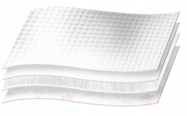 4 Він швидко і рівномірно поширює вологу, завдяки чому шкіра дитини залишається сухою. Після замочування штани пелюшок все ще легкі і не збільшують їх обсяг. Ідеально підходить для використання як вдень, так і вночі. 4 Це дихаючий шар з 3D -тисненням, який забезпечує контакт з шкірою дитини, тим самим мінімізуючи ризик подразнення.• Захист витоку : Зовнішній шар захищає від витоку, а крім того, надзвичайно м'який і ніжний. Не дратує шкіру малюка.