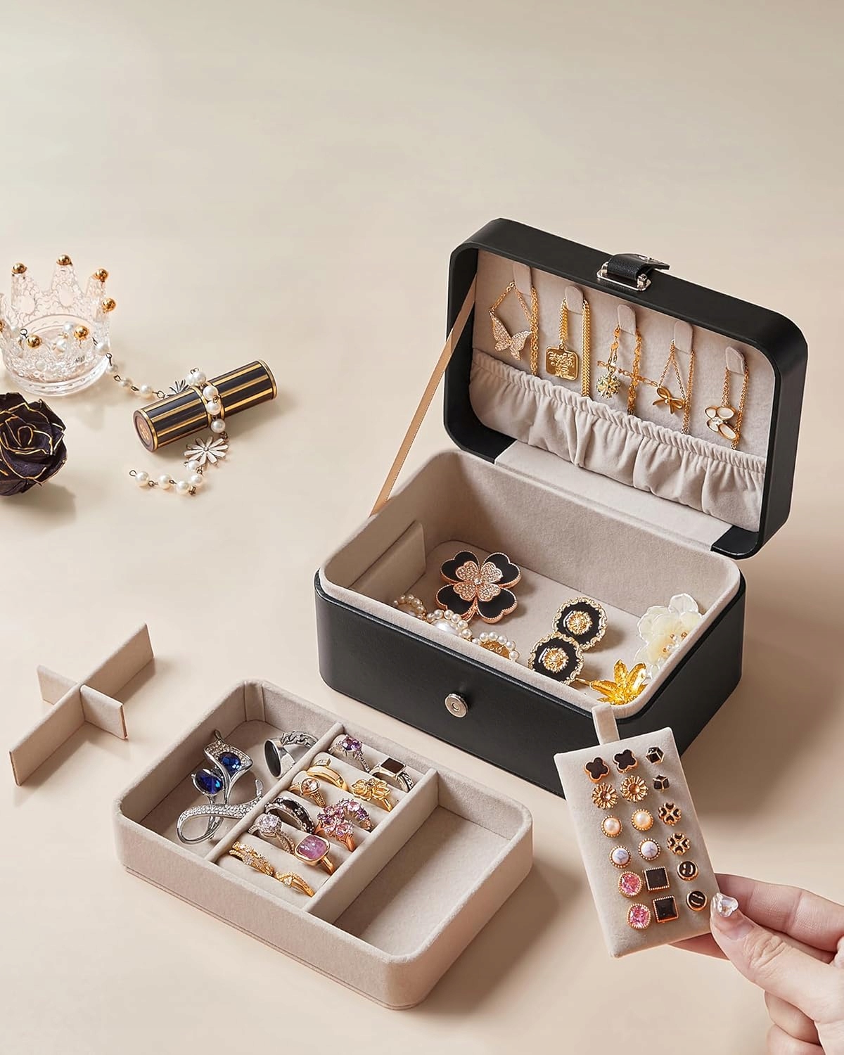 Різноманітні відсіки дозволяють зручно організовувати ювелірні вироби. Ідеальне рішення для людей, які цінують замовлення.
