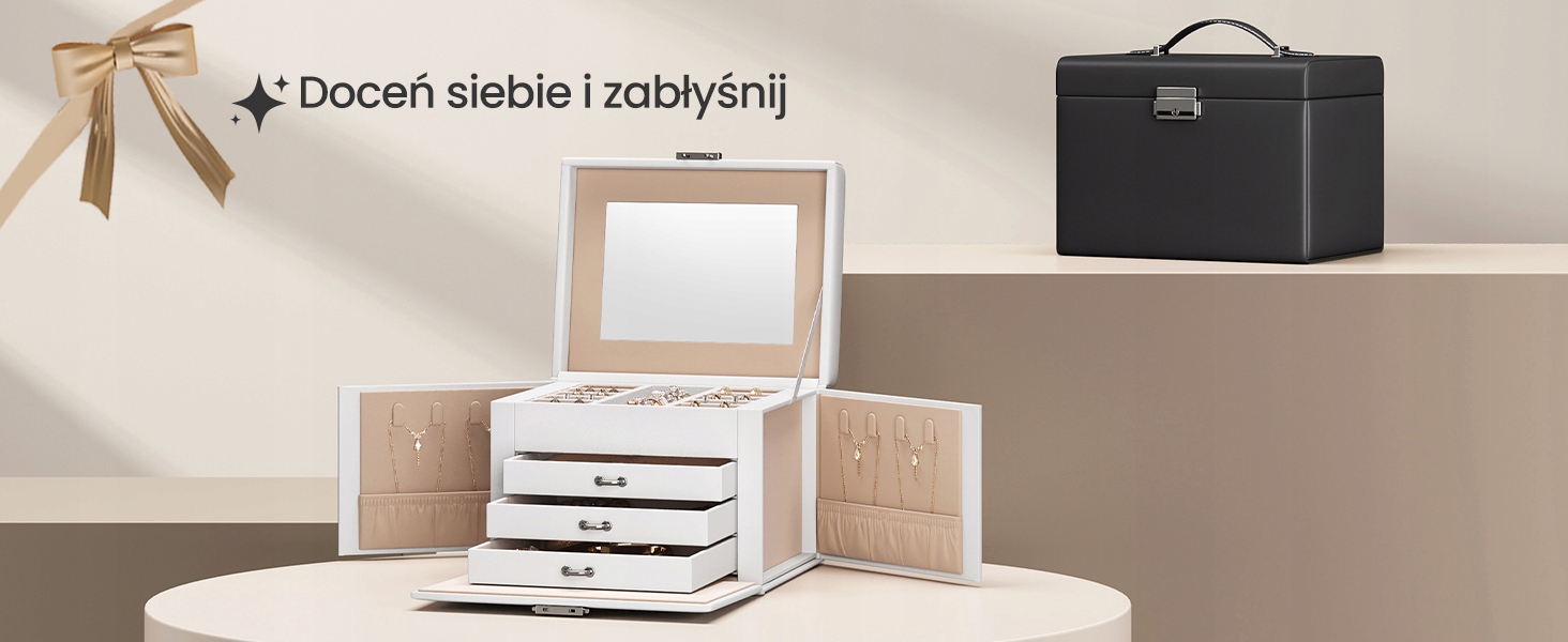 Ви мрієте про ідеальне місце для зберігання своїх прикрас? Ця 4-рівня шкатулка з ящиками, великим дзеркалом і замком-це стильний і практичний організатор, який захистить ваші скарби і допоможе вам виконувати замовлення. Ідеально підходить як для повсякденного, так і для подорожей!
