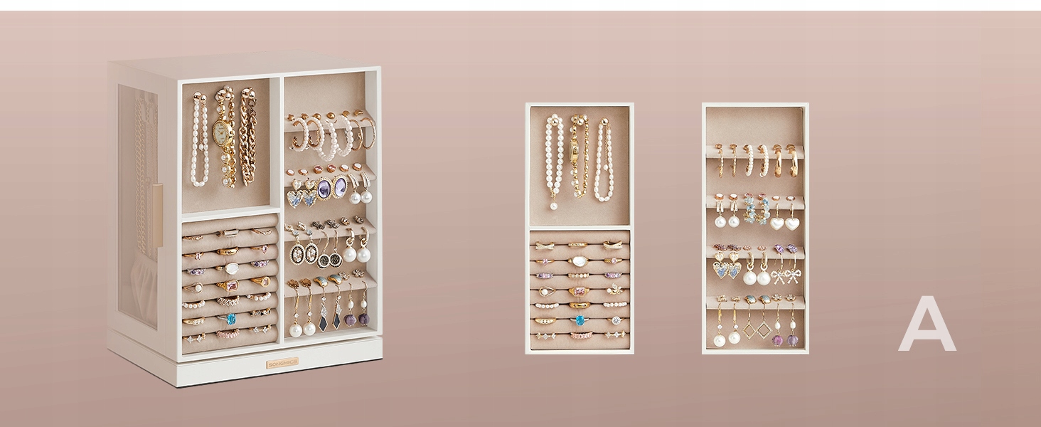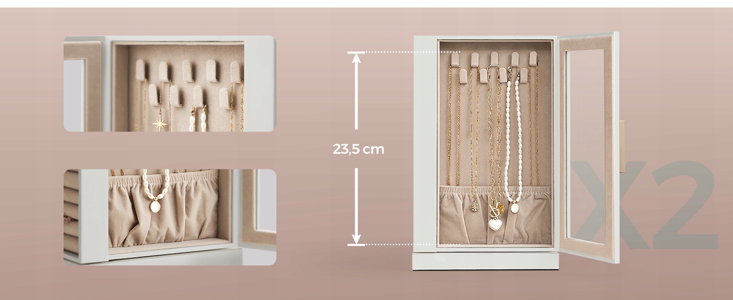 - Дві сторони мають скляні вікна та 9 гачків для кольє (загалом 18 гачків для намиста ) 4 і 24 для сережок палиць)