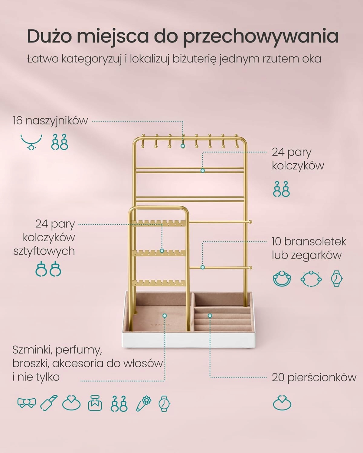 ідеально підходить для зберігання кольє, браслетів, сережок та багатьох інших аксесуарів. Завдяки двом незалежним стендам з відстані 5,8 см, ювелірні вироби залишаються впорядкованими і не заплутуються, що економить місце на столі.