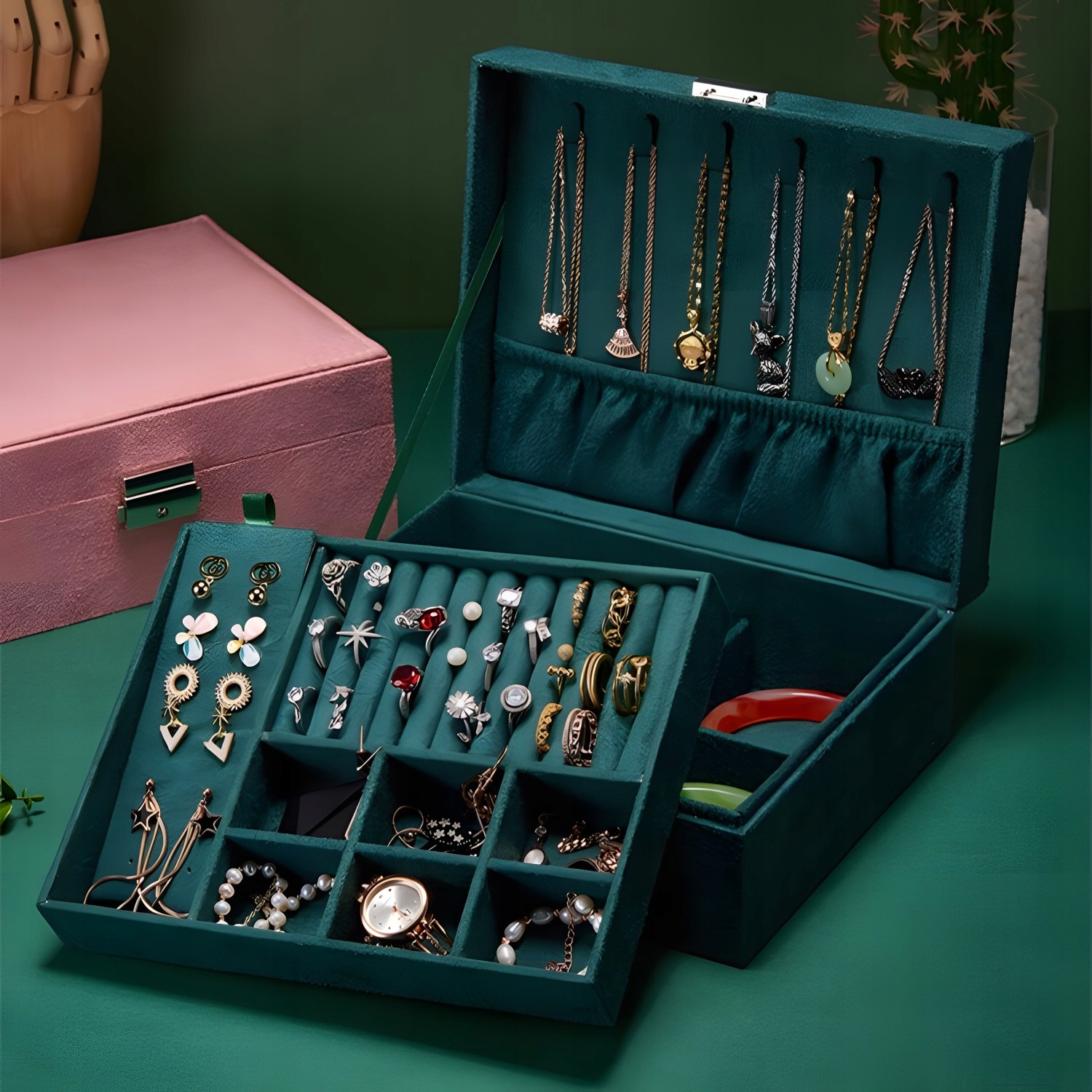 Ця унікальна скринька для прикрас, незважаючи на свої компактні розміри, має неймовірну місткість. Він має 2 рівні, тому ви можете легко розмістити всі свої прикраси. Таке практичне та ергономічне розташування простору робить його незамінним аксесуаром для кожної людини, яка цінує порядок і швидкий доступ до своїх цінностей.