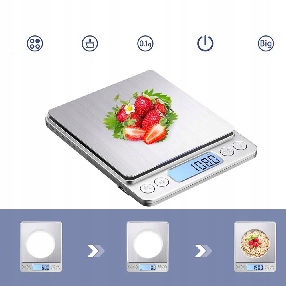 портативний: невеликий розмір, простий у перенесенні та займає невелике місце для зберігання під час використання. Електронні масштаби можна використовувати для зважування овочів, фруктів, інгредієнтів для випічки, повсякденних продуктів та тваринної їжі. Цифрова шкала кухні має 2 лотки, які можна змінити залежно від об'єкта