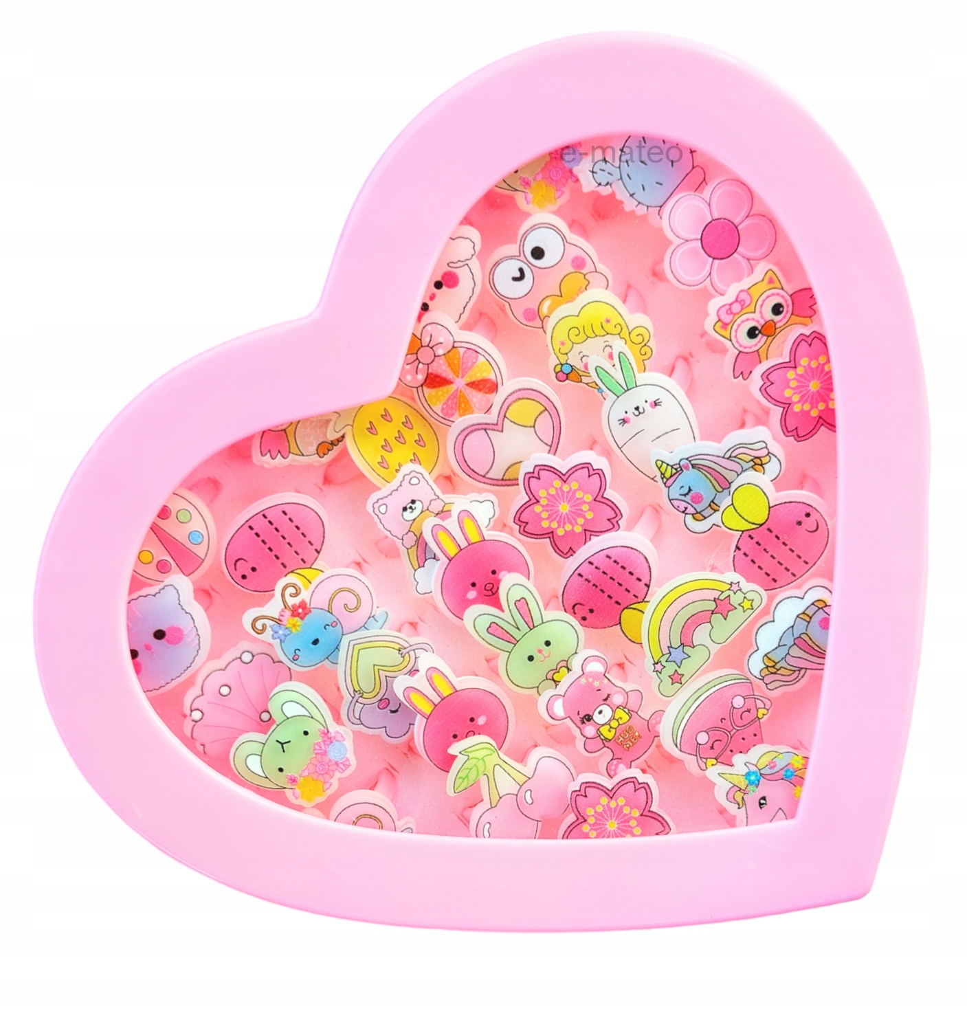 - 36 каблучок з блискучими елементами поміщені в коробочку у формі серця.