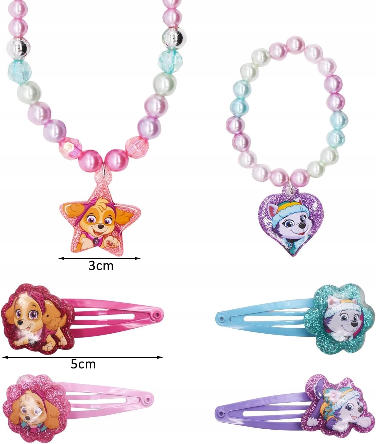 Дитячі ювелірні вироби для дівчат з героями собачого патруля, 4 штуки, шпильки + браслет, намисто для дітей з підвісним зображенням лапи патруля. Дівчата: 4 шпильки (5 см), 1 ланцюг шиї (43 см), 1 браслет (17 см). Роки