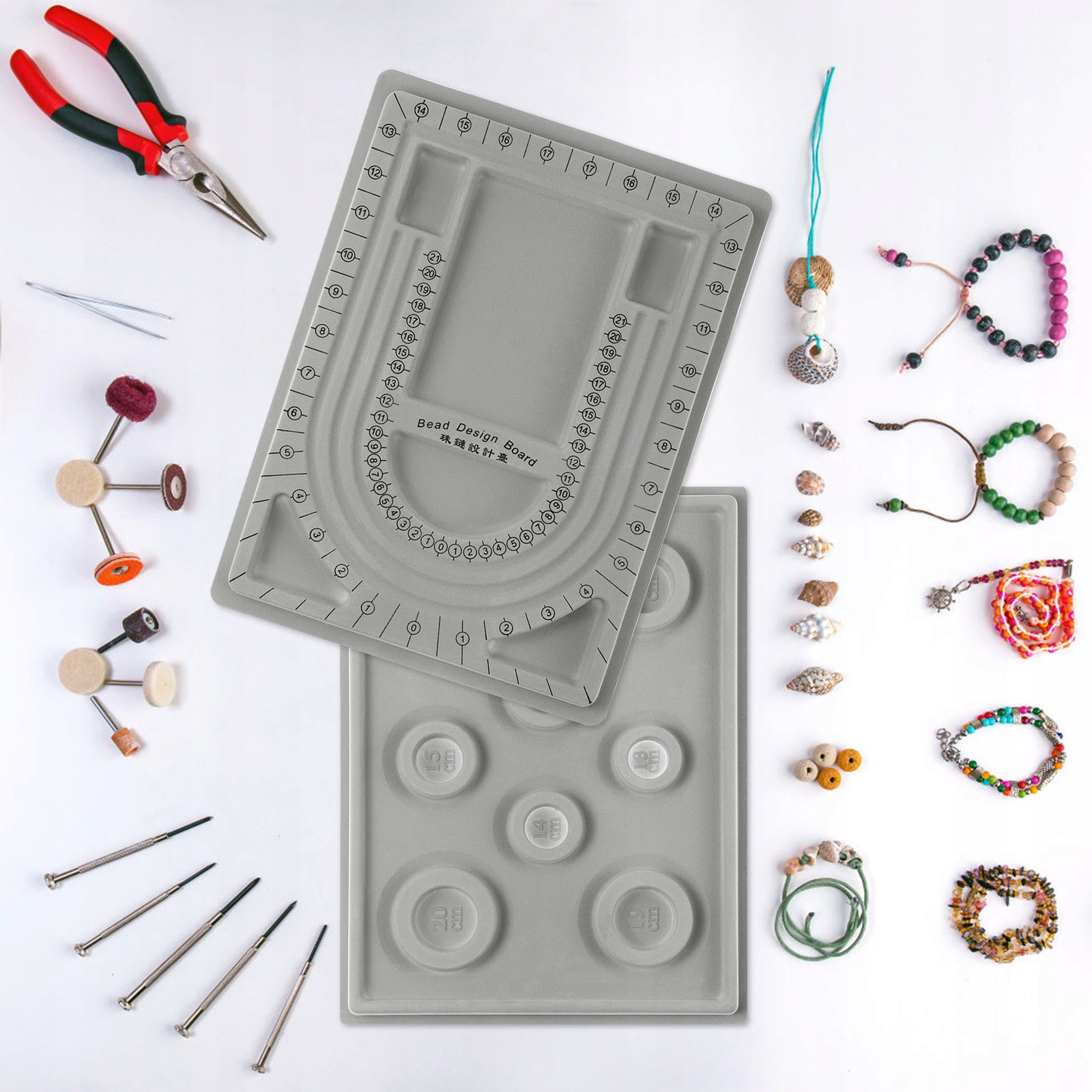 Це лотки для дизайну ювелірних намистин, тож ви не хвилюватиметеся про те, що намистини скочуються, вони допомагають ювелірам вимірювати та регулювати довжину ювелірних виробів у процесі розробки. Це може допомогти вам створювати різні стилі без ниток бісеру, що підходить для браслета та намиста.