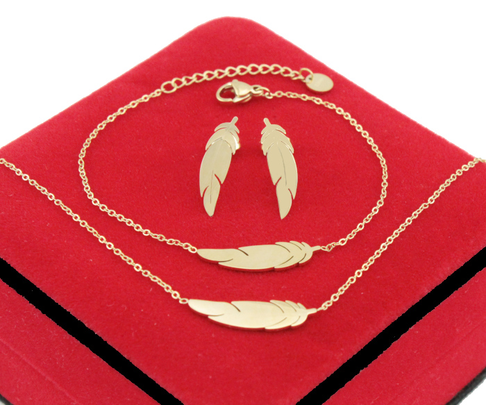 Набір прикрас, золоте намисто з хірургічної сталі, браслет і сережки-гвоздики, мотив пір’я