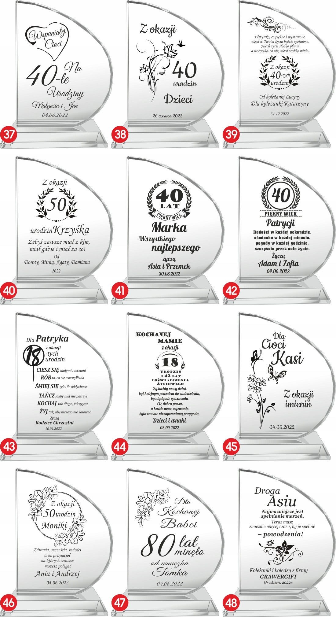 Якщо ви не відповідаєте надісланому нами шаблону інформації, ми не несемо відповідальності за будь-які помилки в гравіюванні. Тексти та варіанти можна вільно змінювати на свій розсуд (тексти, окрім тих, що є в наших варіантах, слід переписати на комп’ютері та надіслати нам, наприклад, у блокноті). Числа річниці є прикладами та можуть бути змінені. Тексти, надіслані у вигляді скріншотів або фотографій, не будуть транскрибовані. Транскрибований текст необхідно надати. Продавець повідомляє, що вироби зі скла можуть містити дрібні повітряні бульбашки та подряпини на поверхні, які є результатом виробничого процесу.