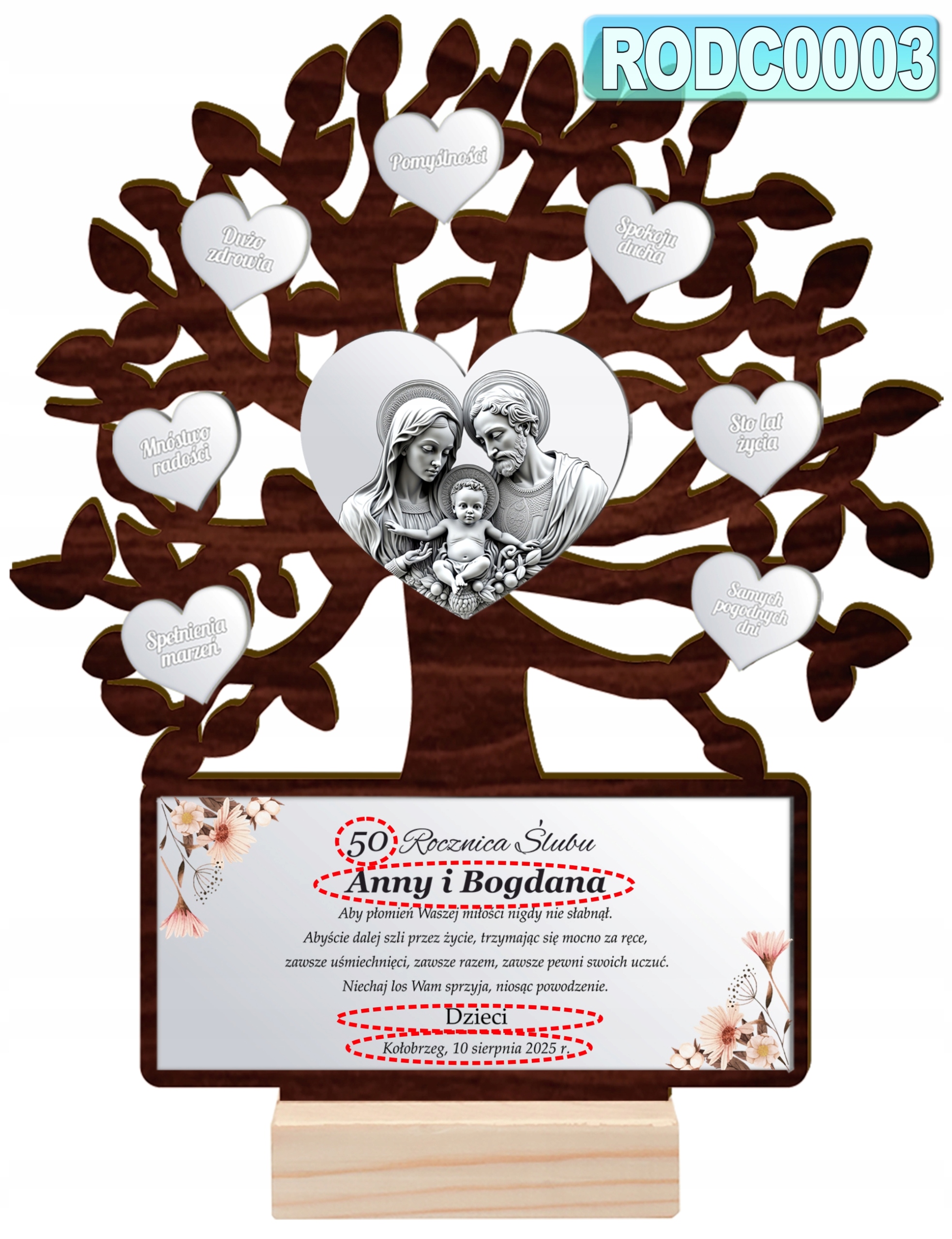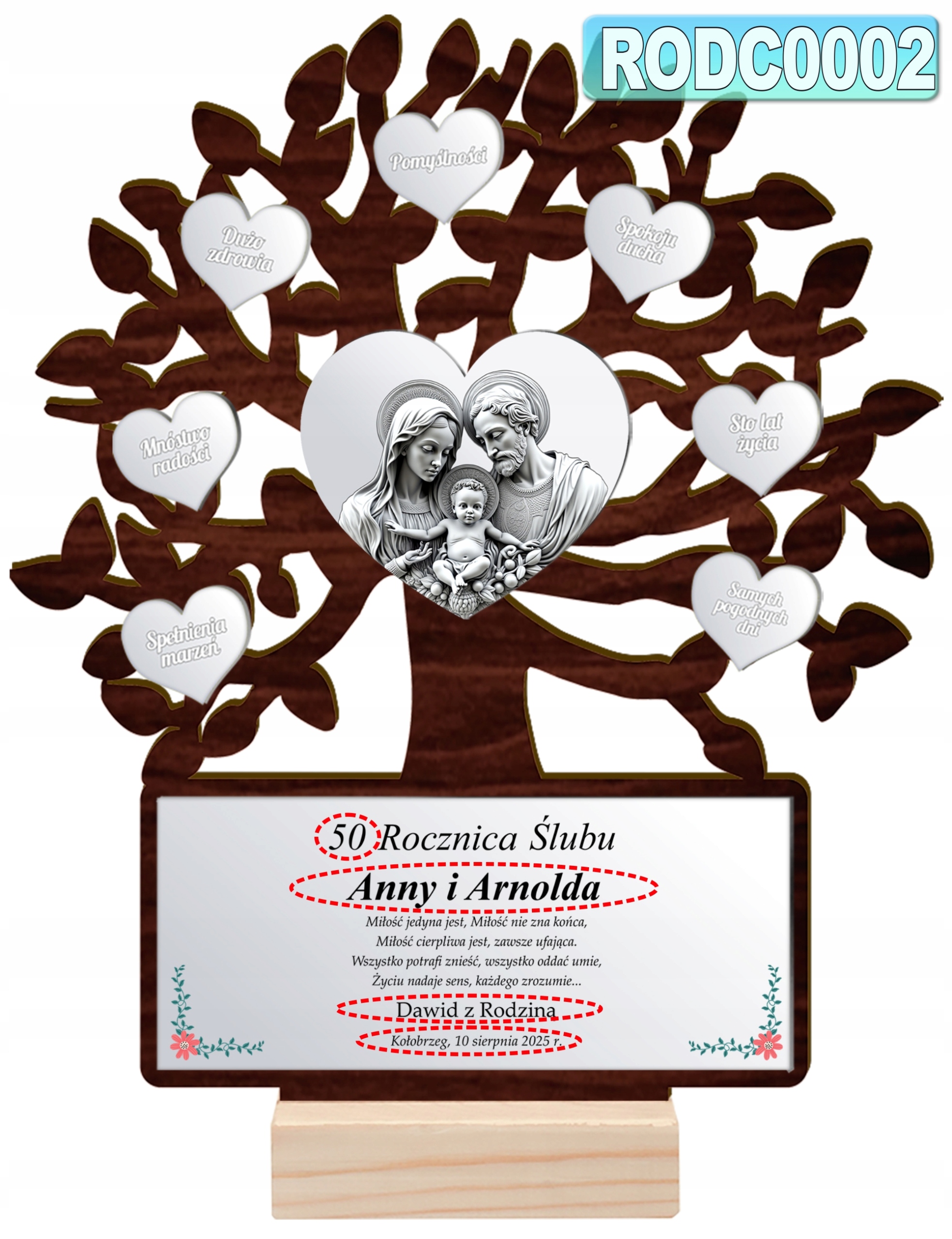 Елегантне Дерево щастя із зображенням Святої родини - унікальний подарунок для весільного ювілею . Зроблений з суцільної MDF Wood , з прекрасними деталями та дзеркальним покриттям, буде чудовим сувеніром для батьків, бабусь і дідусів чи близьких людей. Завдяки персоналізованим елементам , наприклад, сріблястим сердечкам та посвяченій тарілці, подарунок стає унікальним і адаптованим до цього випадку.
