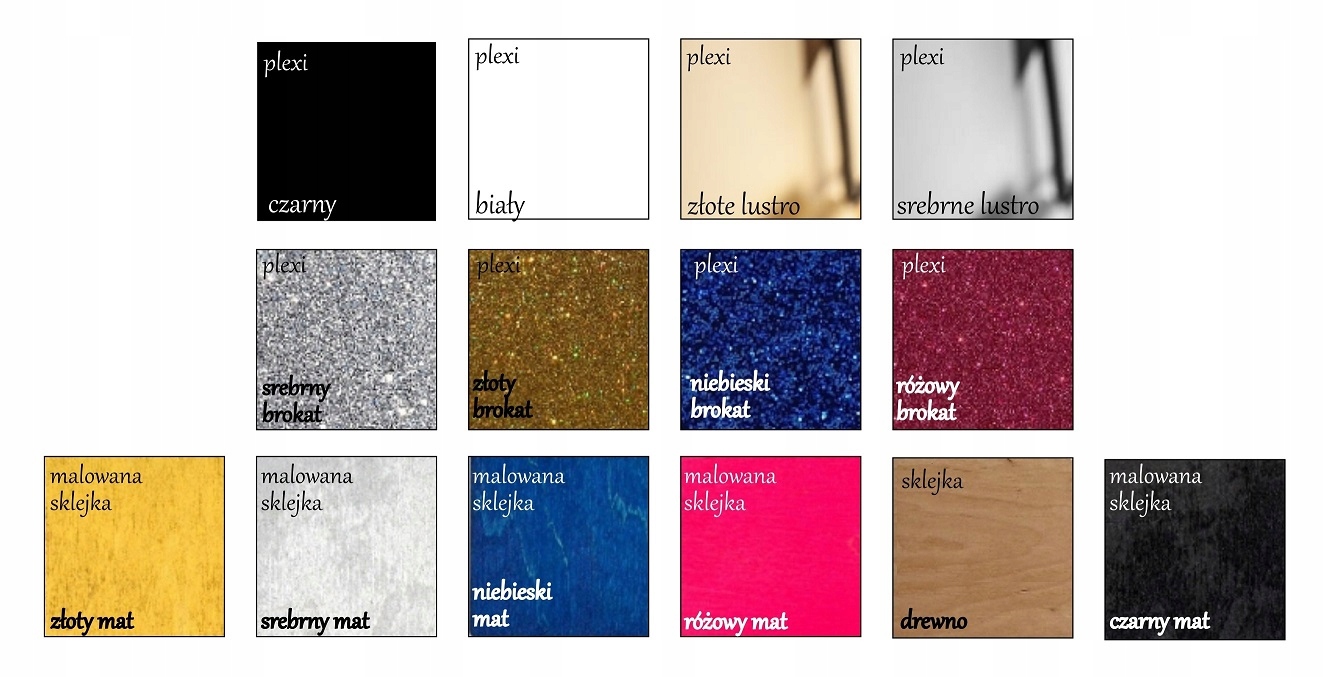 - оргскло: чорне оргскло, біле оргскло, золоте дзеркало, срібне дзеркало
