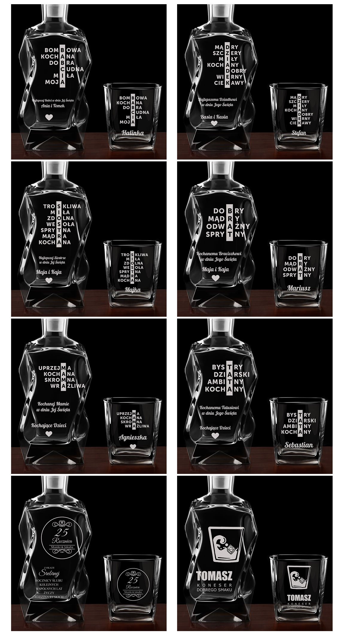 Графин ізвисокоякісного склаз персональною присвятою — чудова ідея дляподарунку.У набір також входятьшість келихів з гравіюванням. Оригінальна присвята, виконана в техніці лазерного гравіювання, безумовно, стане цікавою альтернативою типовим подарункам. Класична скляна конструкціяпідкреслює елегантний зовнішній вигляд подарунка, а в поєднанні з персональною присвятою стане унікальним і водночас практичним сувеніром протягом багатьох років.