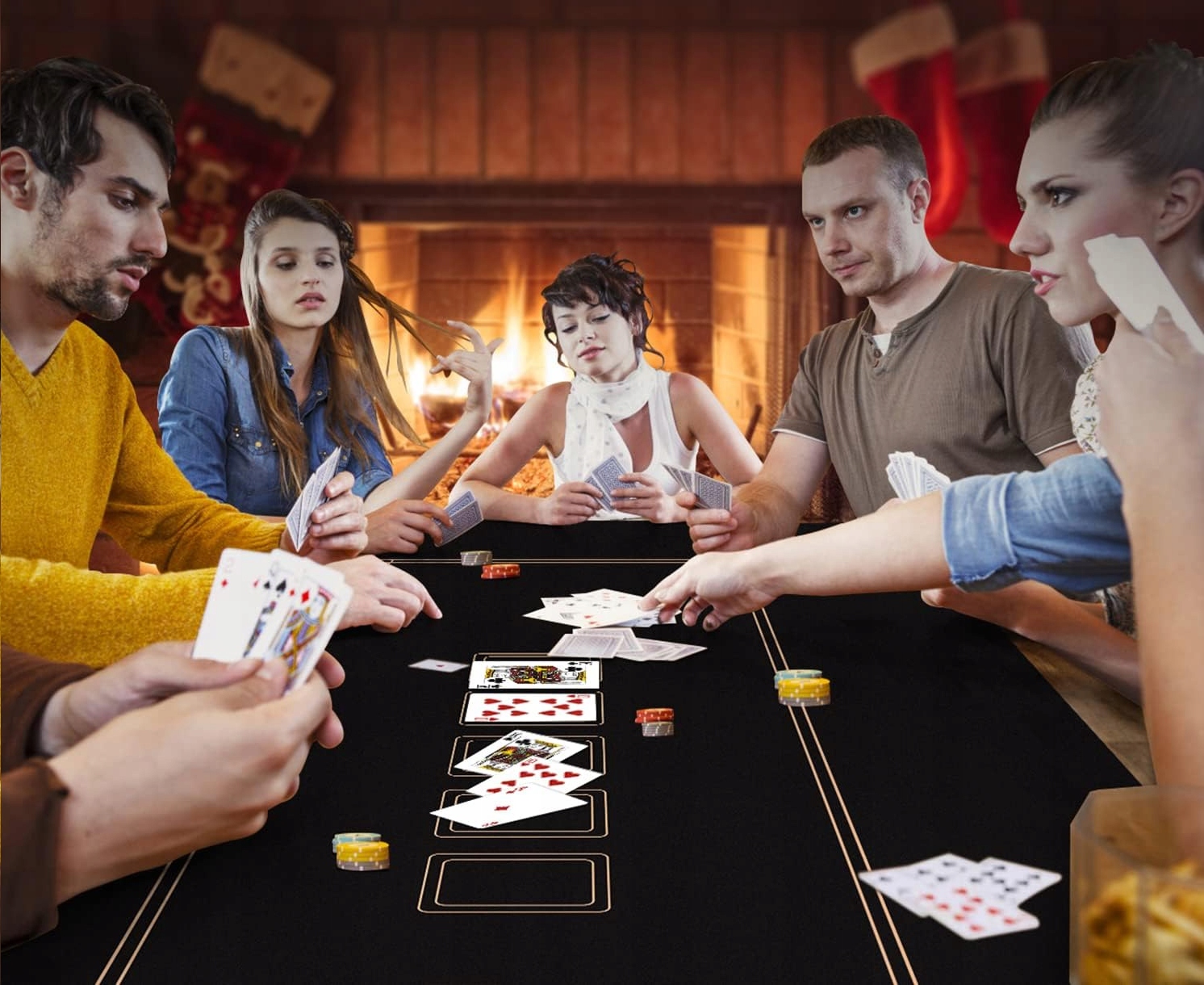 [6 гравців Texas Hold'em Poker Mat] Розміри: 120 х 60 см. Ця покерна система може перетворити будь -яку таблицю в таблицю професійних покерних ігор. Розмір дуже підходить для вашого столу та підтримує багатокористувацьку. Елегантні лінійні конструкції надруковані поверх покеру і дають картковій грі трохи витонченість. Перемістіть покерну ніч на абсолютно новий рівень!
