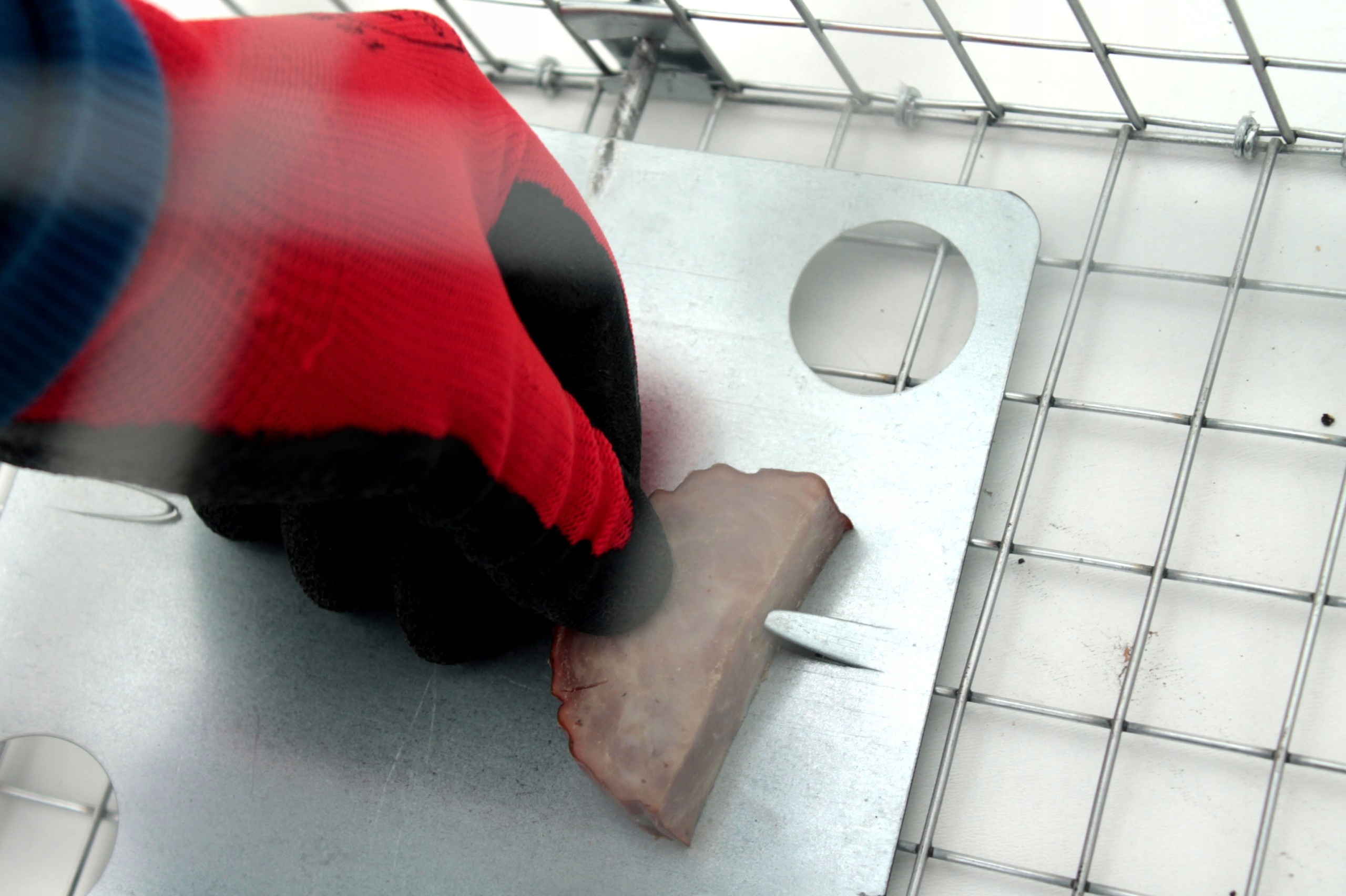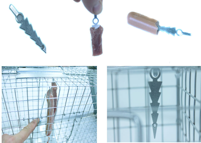 лоток для землі має спеціальні м'ясні гачки - наші пастки додатково обладнані гачками для м'ясних штампів, щоб тварина не могла зняти його з лотка, не переміщуючи його, коли тварина не має про це - він вважає, що м'ясо просто лежить на лотці і намагається взяти його - воно переміщує висипання і закриває пастку !! Гачки можуть бути приховані в землі. У цій пастці є 2 такі гачки.