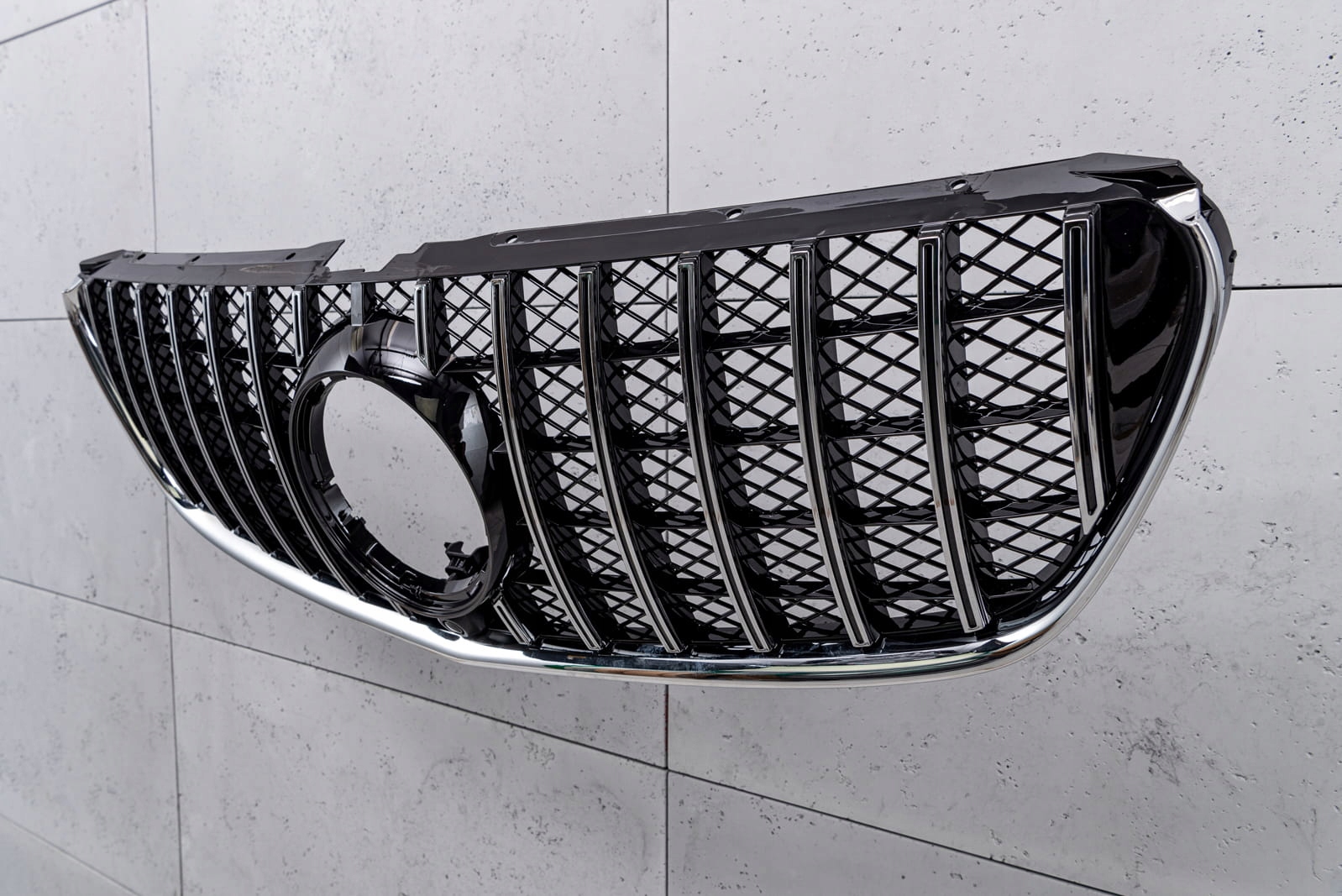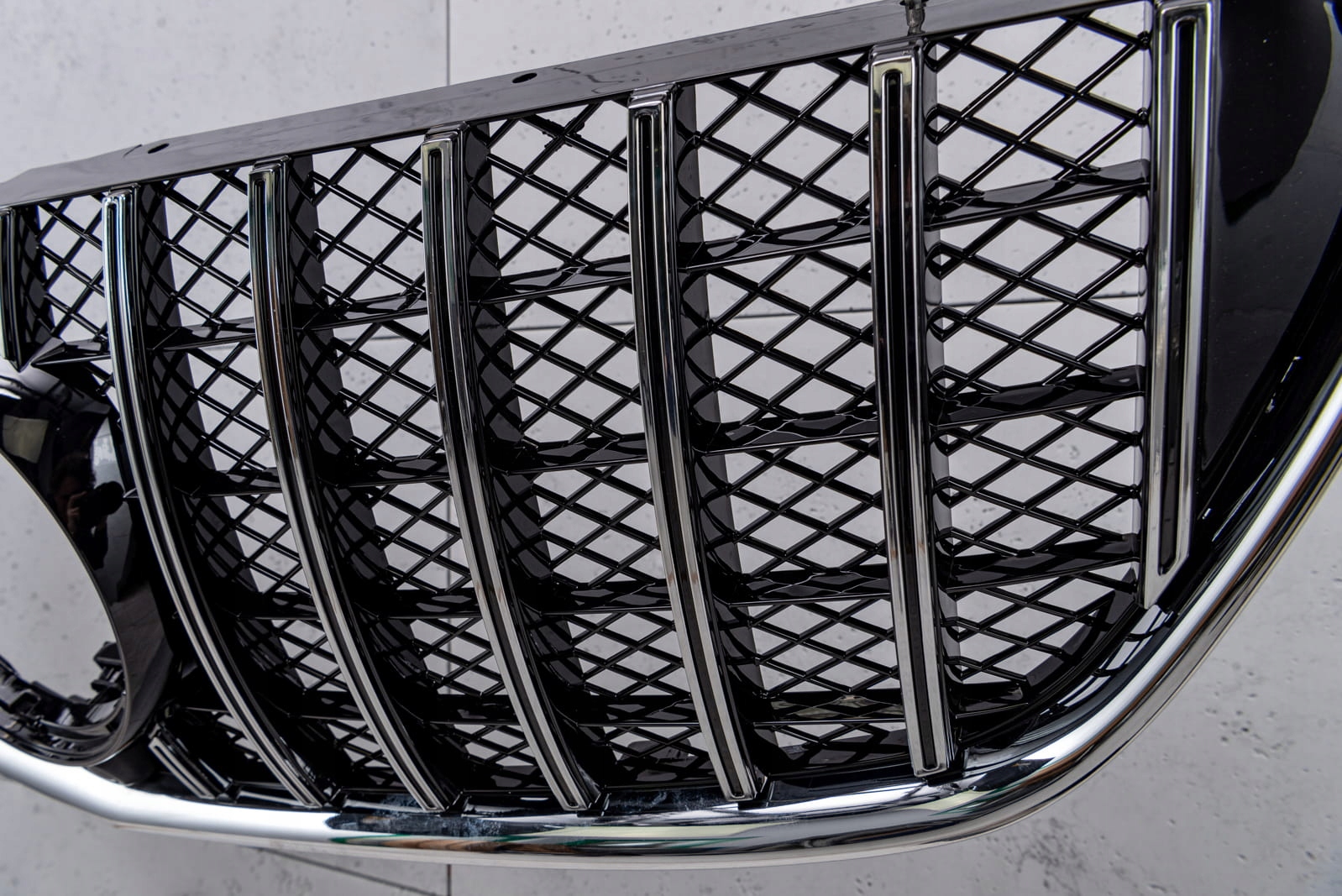 Спеціальна решітка розроблена в стилі, типовому для автомобілів сегменту GT. Решітка радіатора прикрашена широкими хромованими поперечинами, які неминуче нагадують про респектабельні, потужні автомобілі топ-полиці. Елемент вражає своїм спортивним характером, а глянець хромованих елементів додає елегантності - завдяки чому він ідеально поєднується з вражаючим дизайном Mercedes.