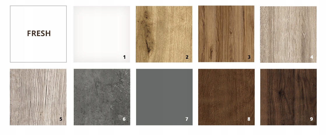 1. Білий 2.Дуб Вотан 3. Дуб Катанія 4. Дуб Сонома5. Дуб Сан Ремо 6. Лофт 7. Антрацит 8. Дуб місячний 9. Темна колона