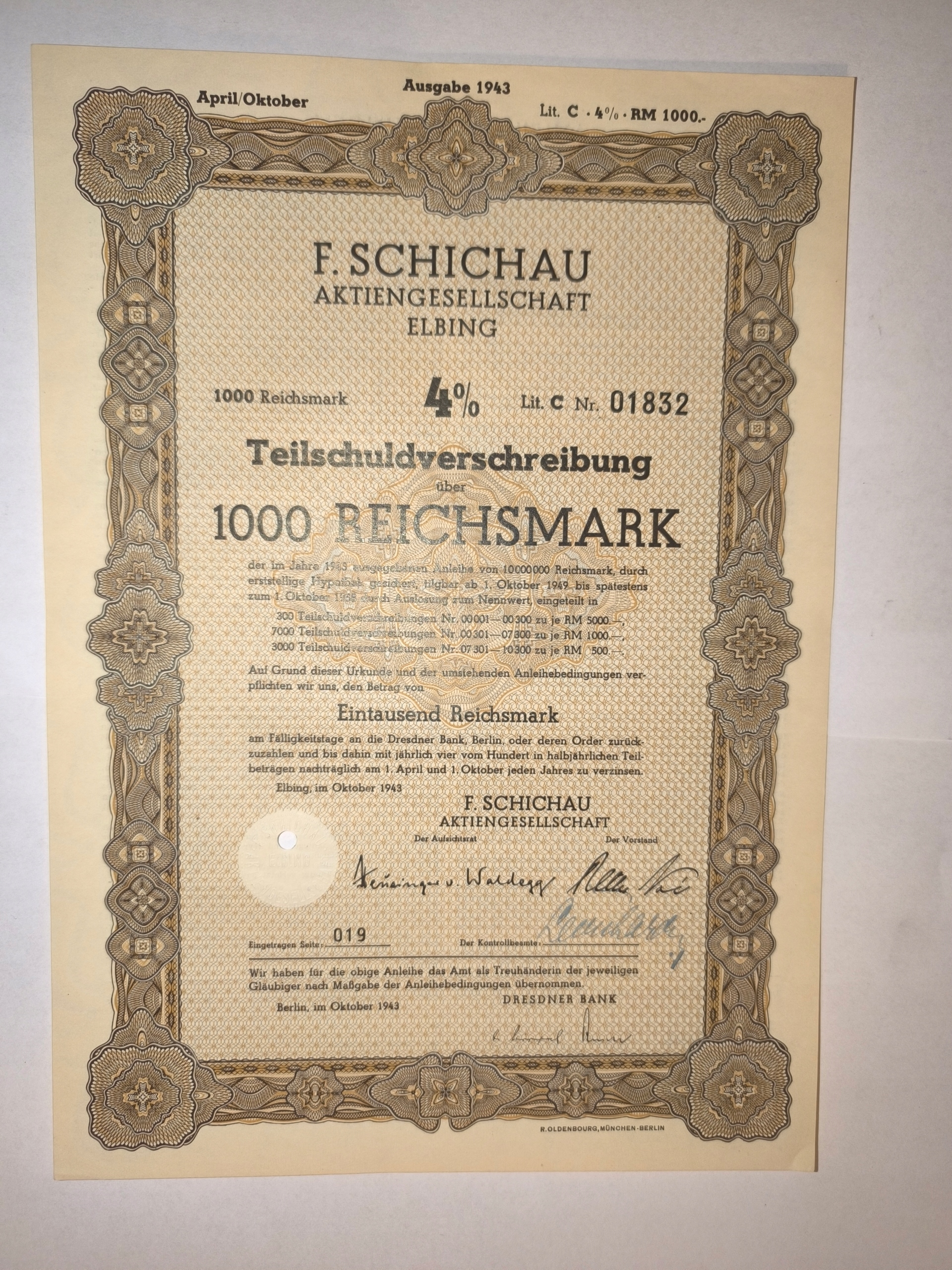 ОБЛІГАЦІЇ СУДНЕВЕРФІ ELBLĄG, ВИПУЩЕНІ В 1943 РОЦІ, ЗІ НОРМАТОМ ДОХОДУ 4%!!!