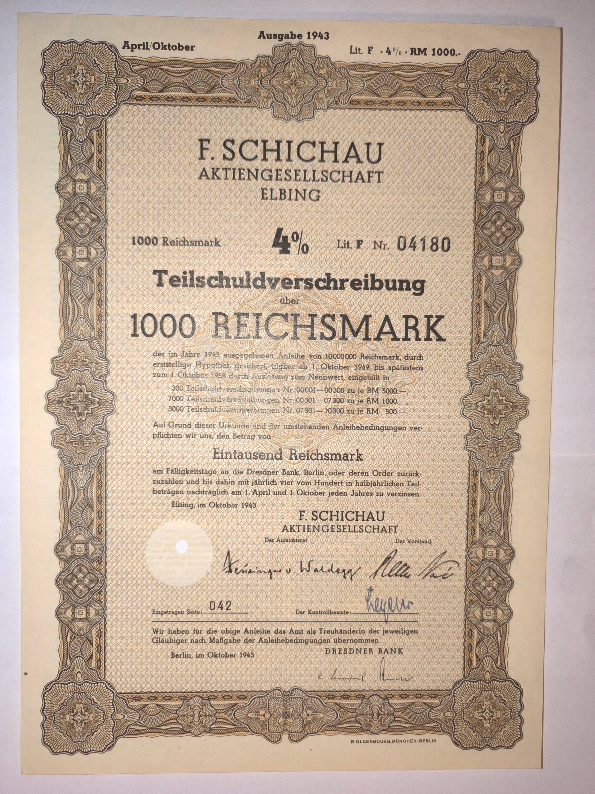 ОБЛІГАЦІЇ СУДНЕВЕРФІ ELBLĄG, ВИПУЩЕНІ В 1943 РОЦІ, ЗІ НОРМАТОМ ДОХОДУ 4%!!!