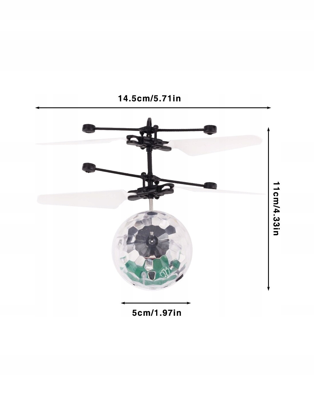 Це чудово для гри з дітьми. М'яч літа і мерехтіння з багатьма кольорами. Ідеальна робота для вашої дитини. У вертольоті є спеціальний датчик, розміщений на дні кулі, завданням якого є відстеження об'єкта під ним (наприклад, рука). Датчик регулює роботи гвинтів: змінює кількість революцій та висота польоту. > Зарядка вертольота робиться за допомогою зарядного пристрою USB - вона створила вбудований акумулятор. Просто підключіть м'яч до зарядного пристрою.