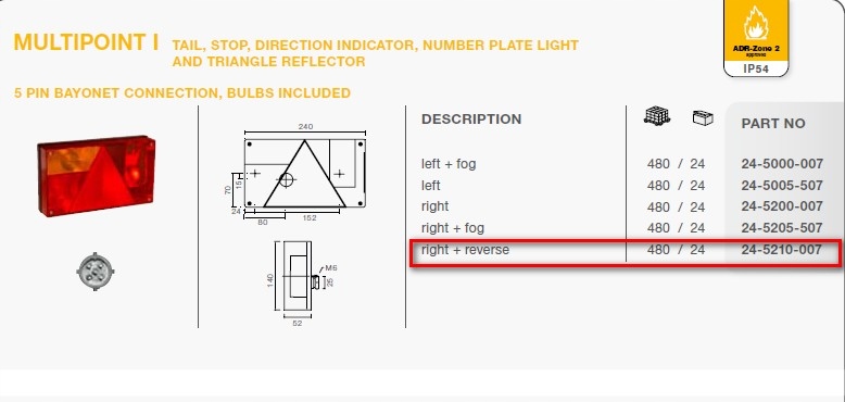 Предметом продажу є оригінальна нова лампа Multipoint I фірми ASPÖCK. Це правий, комбінований ліхтар, який монтується в причепи або евакуатори. Лампа має наступні функції: задні габаритні ліхтарі, покажчики повороту, стоп-сигнали, світловідбиваючі трикутники та освітлення номерного знака.