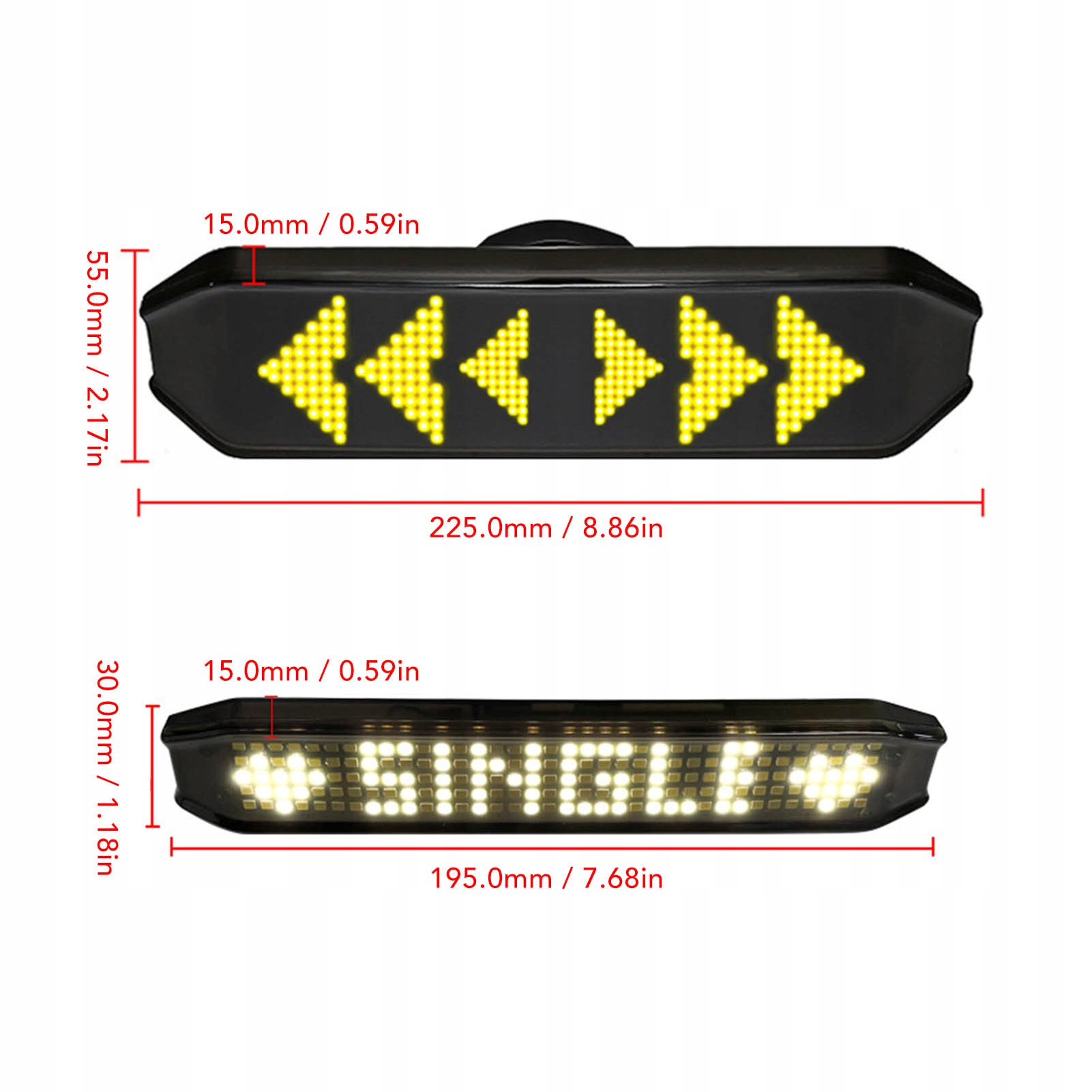 Функція:1. Світлодіодний екран Bluetooth: цей велосипедний покажчик повороту оснащений жовтим світлодіодним логотипом 12 x 48 точок, який дуже стильний і підключається до вашого смартфона через Bluetooth (для iOS 8.0 і Android 4.3 і вище), програму можна програмувати за допомогою шаблонів, текст, каракулі.