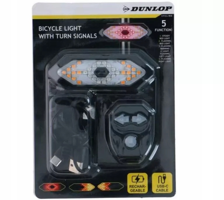 Велосипедний ліхтар Dunlop пропонує п'ять функцій освітлення, включаючи сигнал повороту, що підвищує безпеку під час маневрів на дорозі. Завдяки різним режимам, таким як постійне, миготливе або пульсуюче світло, велосипедист може регулювати інтенсивність світла відповідно до умов їзди. Вбудований світлодіодний покажчик повороту полегшує подачу сигналу про зміну напрямку, що покращує видимість і зв’язок з іншими учасниками дорожнього руху.