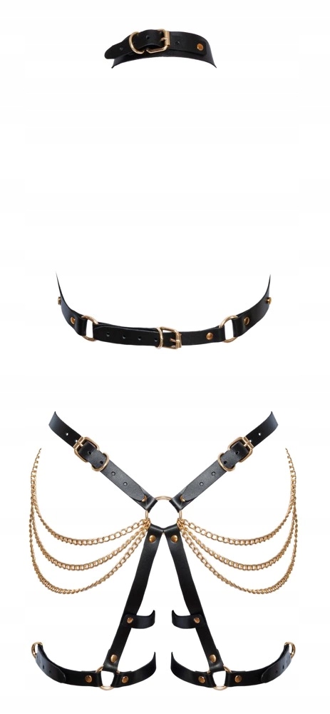 Обидві речі мають чорні шкіряні ремінці з багатими золотими ланцюжками та декоративними шпильками, каблучками та пряжками. Багатоступеневе регулювання для ідеальної посадки.