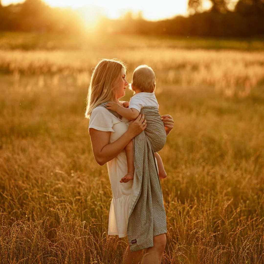 - шарф ідеально підтримує спину дитини, надаючи їй С-подібну форму (природний вигин хребта новонародженого), а правильна підтягування тазу дозволяє встановити тазостегнові суглоби в положення, що підтримує їх правильний розвиток (ніжки повинні бути розставлені на ширині приблизно 60°-90° відносно осі тіла, а коліна повинні бути трохи вище низу (так звана буква). "М")