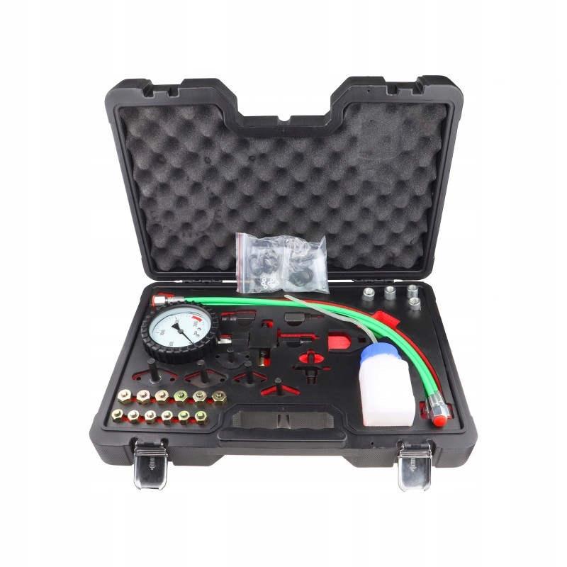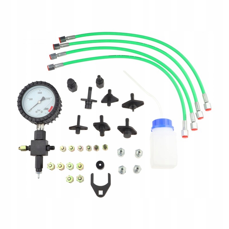 Високий тиск, аналоговий тестер високого тиску з різними кабелями з'єднання для перевірки насуса високого тиску/систем під час запуску або експлуатації кривошипа. Шкала читань з 0-2000 бар. Тестер має вбудований клапан вивільнення тиску, який обмежує максимальний тиск до приблизно. 1500 бар для запобігання пошкодження насоса. Тестер оснащений двома наборами гнучких шлангів, що дозволяють підключитись до жорстких -доречкових місць.