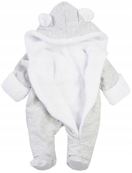 Крій: Комбінезон з капюшоном і кумедними вушками. Застібається на зручну блискавку від однієї штанини до шиї. На кінці блискавки на шиї є захист від матеріалу, щоб не защемити обличчя дитини ;-) В рукавах закатані рукавички.