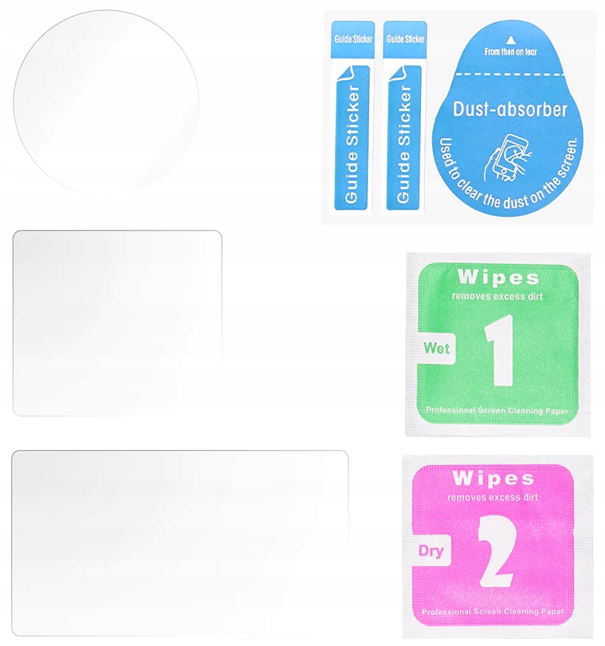 У набір входять спиртові серветки та наклейки для видалення пилу, завдяки яким ви можете підготувати лінзи та екрани до встановлення скла.