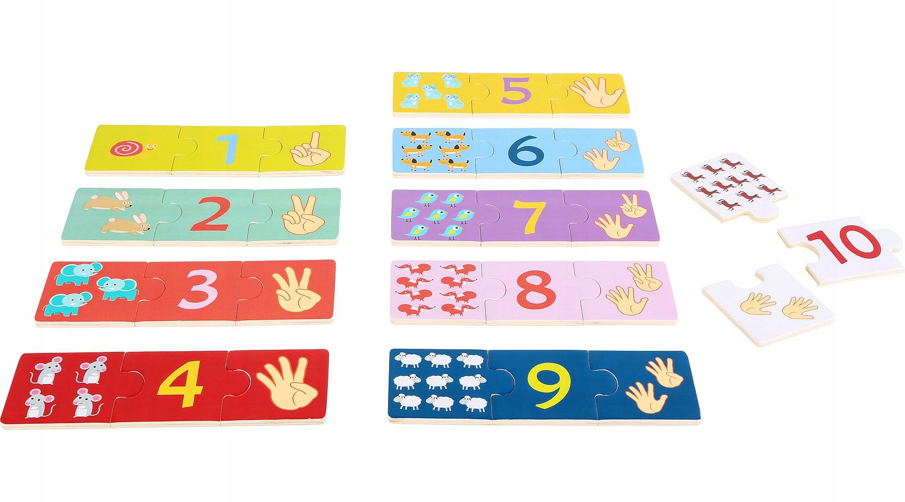 Вкладено 30 дерев'яних кольорових пазлів разом по три в ряд. Блоки представляють відповідно: ЦИФРИ, ЕЛЕМЕНТИ, що ілюструють значення цифр (наприклад, 2 зайчики, 3 слони) та РУКУ, що показує задану цифру на пальці. Вам просто потрібно знайти та підключити їх добре. Це все весело. Замовлений пазл розкриє міні-картинку з 3 частин. Пазл також можна використовувати як гру на ПАМ'ЯТЬ. Потім ми перевертаємо блоки лицьовою стороною донизу, а потім намагаємося перевернути 3 блоки, які походять від одного конкретного числа.