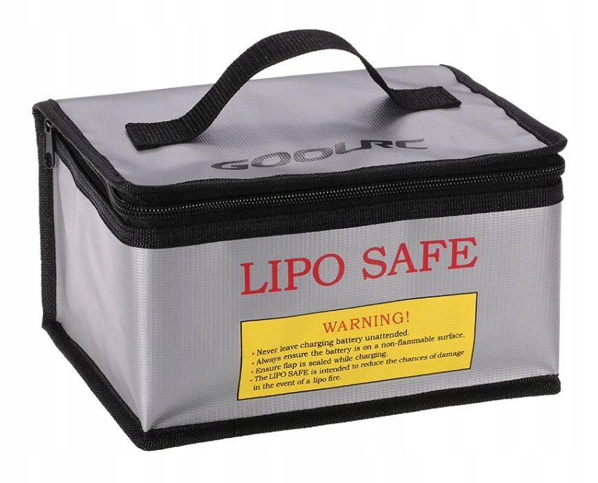 Захисна кришка для Li-Po акумуляторів. Він виготовлений із вогнестійкого матеріалу, захищає від вогню та обмежує надходження кисню, забезпечуючи таким чином високий рівень безпеки. Використовується для безпечної зарядки, зберігання та транспортування Li-Po акумуляторів. Чохол закривається на блискавку.