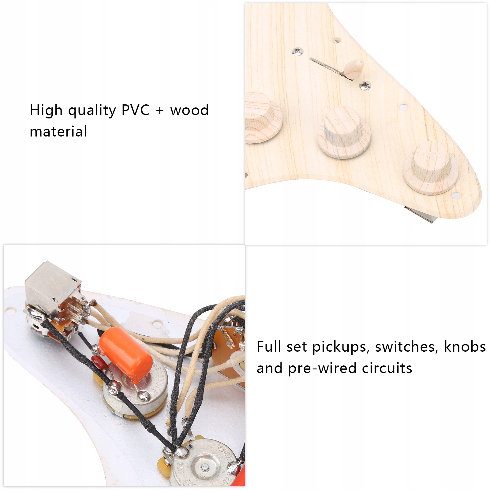1. Продукт являє собою набір звукознімачів Alnico 5 з провідною гітарною пікгардою SSS і гвинтами. 2. Решітка SSS з 11 отворами (кожух перетворювача) містить повний набір перетворювачів, перемикачів, ручок і попередньо підключених схем. 3. Запасні частини гітари відповідають американському стандарту електрогітари FD 4. Доступні два кольори клена та палісандра, що є гарною прикрасою для вашого музичного інструменту. 5. Виготовлені з високоякісного ПВХ і деревини, вони легкі та прості в складанні