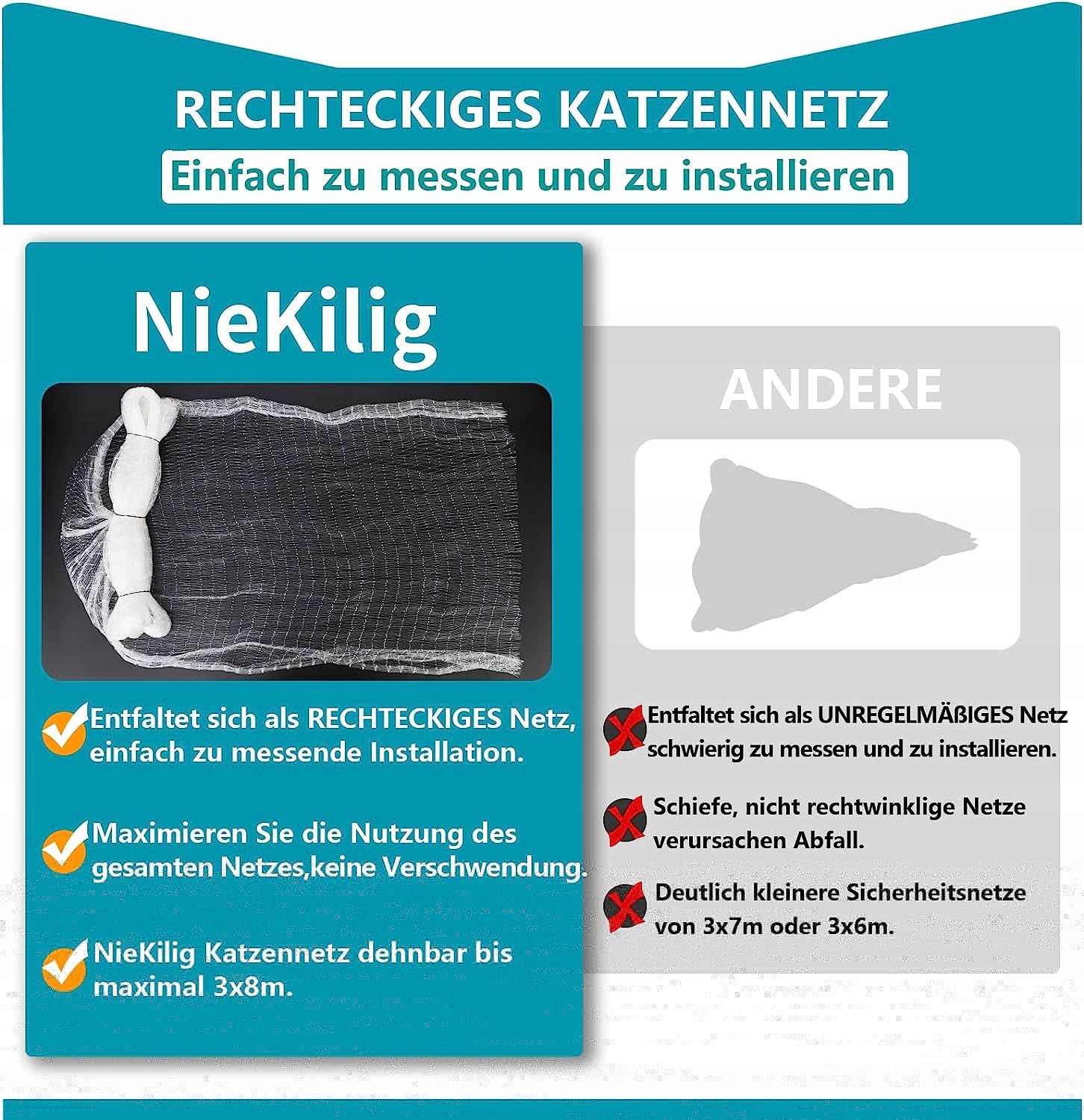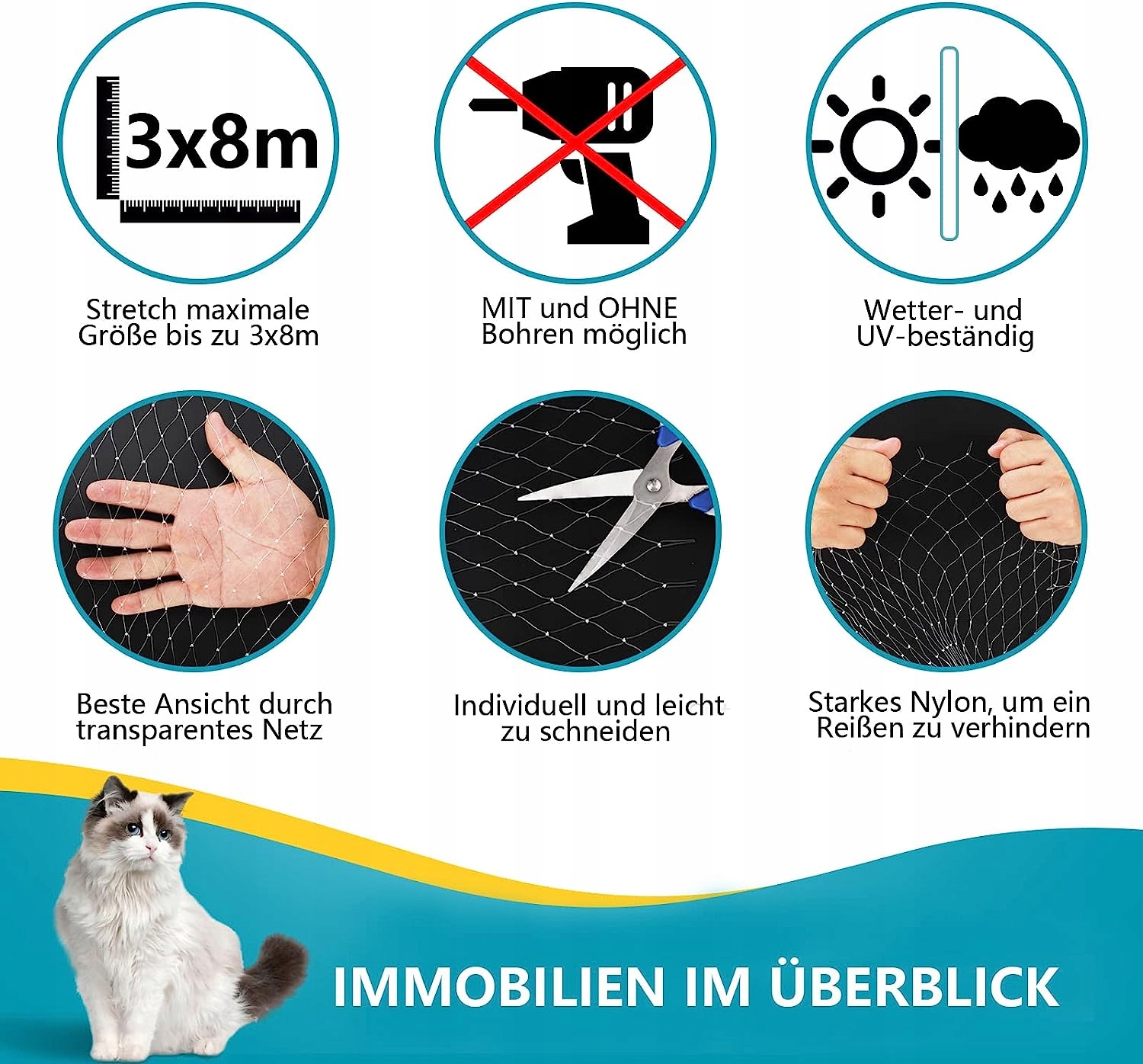 Збільште максимальний розмір до 8 x 3 м. Сітка для котів має дуже міцний захист балкона та дуже довговічна завдяки високій якості, стійкості до розривів, Стійкі до ультрафіолету та погодних умов матеріали. Можна різати залежно від розміру, гнучкий для підвіконня, тераси, балкона. Більше свободи та безпеки простору для котів у будь-яку пору року.