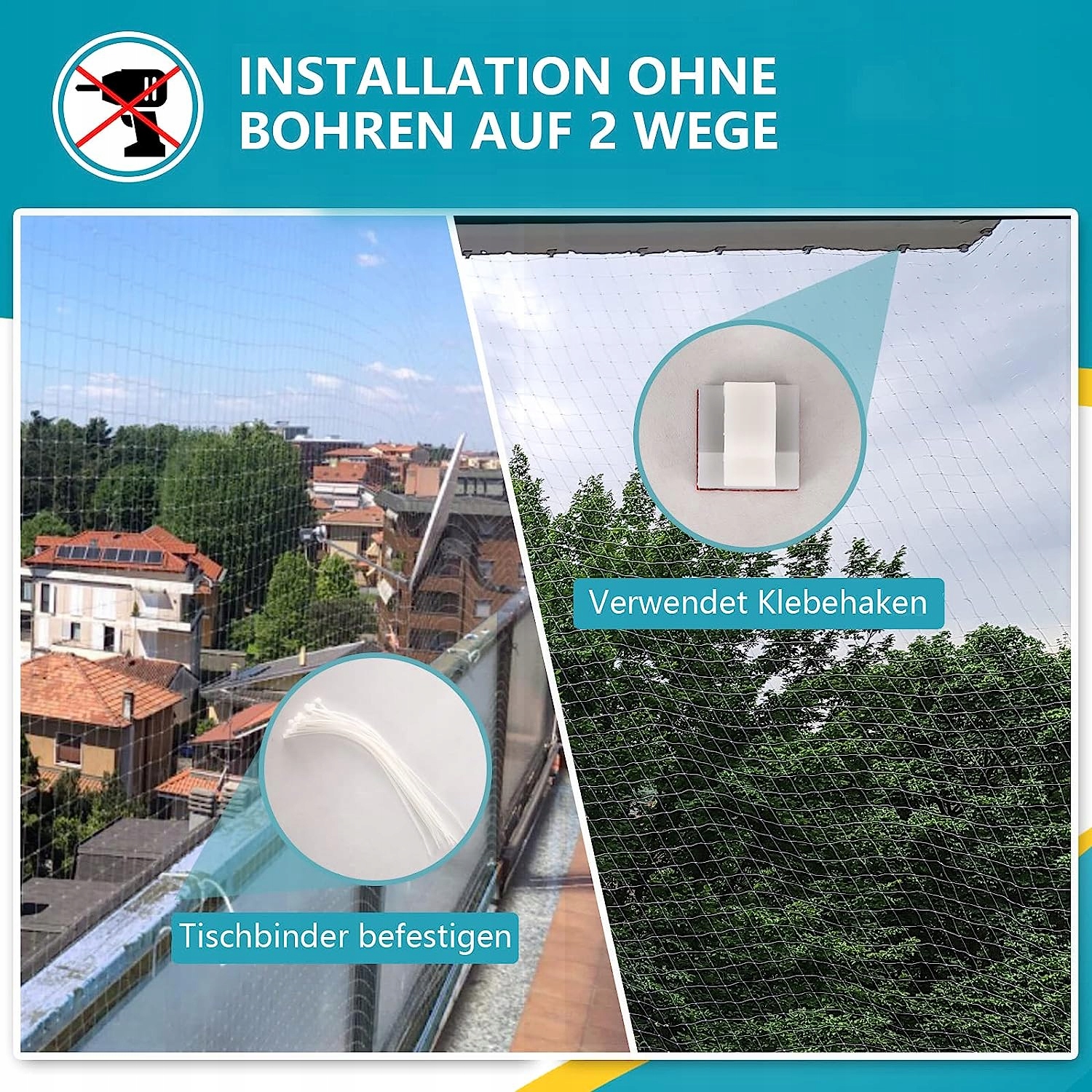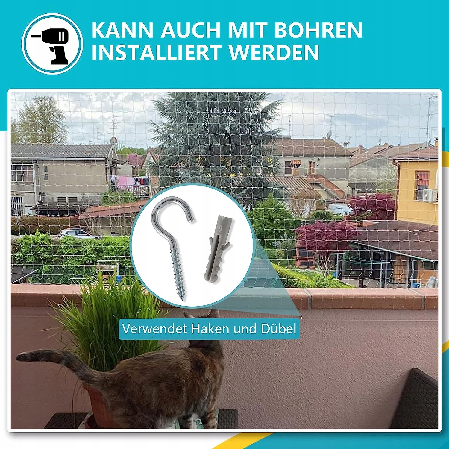 Сітку для котів можна безпечно встановити безпосередньо за допомогою клейових гачків або кабельних стяжок без свердління. Звичайно, ви також можете встановити сітку для котів за допомогою гачків і дюбелів, що входять у комплект.