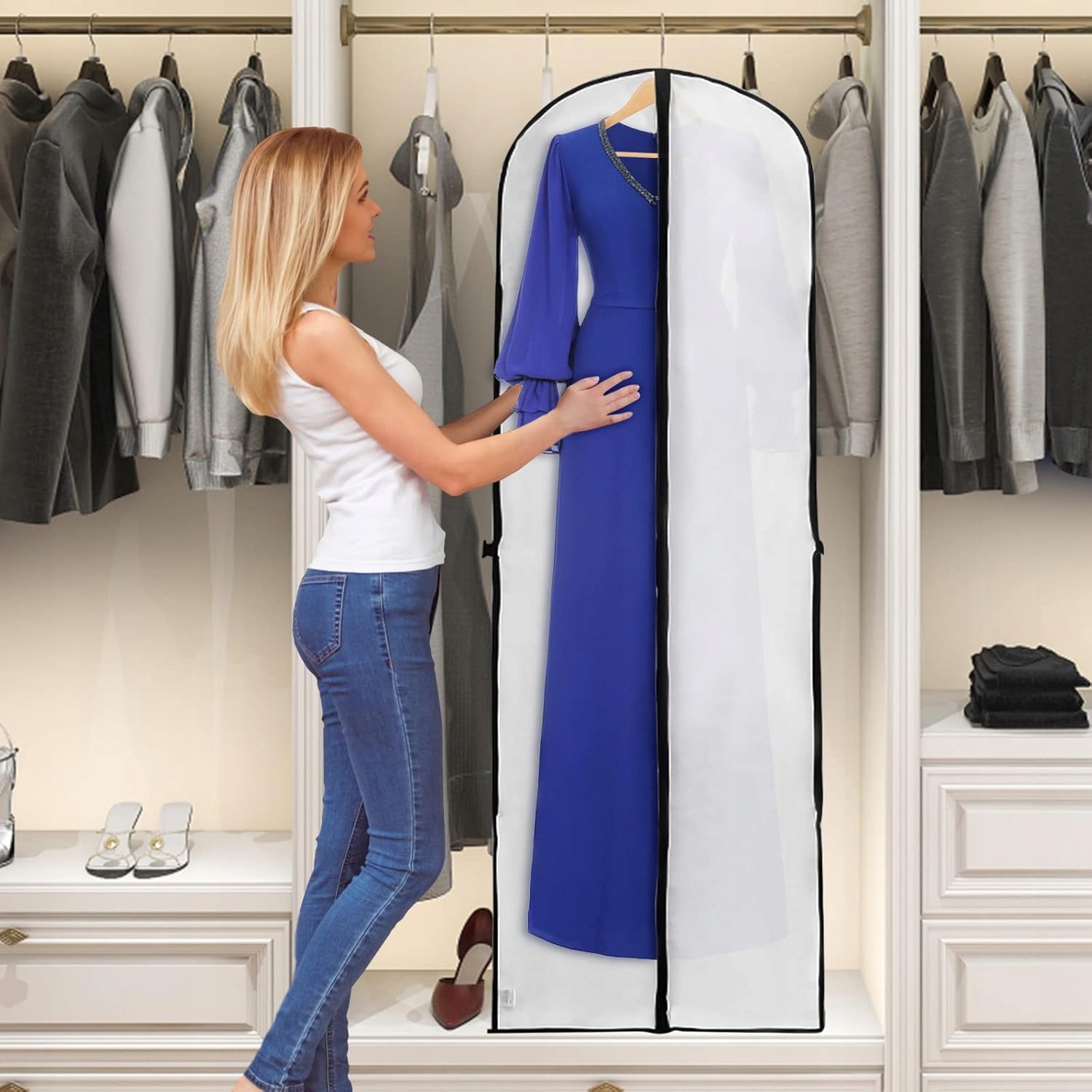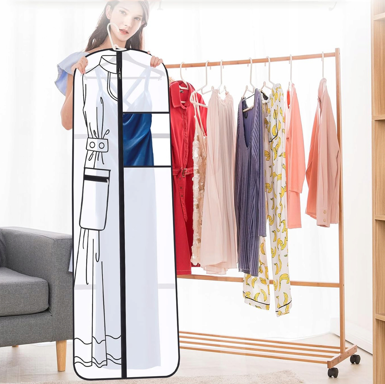 - Ідеально підходить для зберігання весільних суконь, костюмів, довгих спідниць, вечірніх суконь, довгих пальто, суконь, випускних суконь та багато іншого.