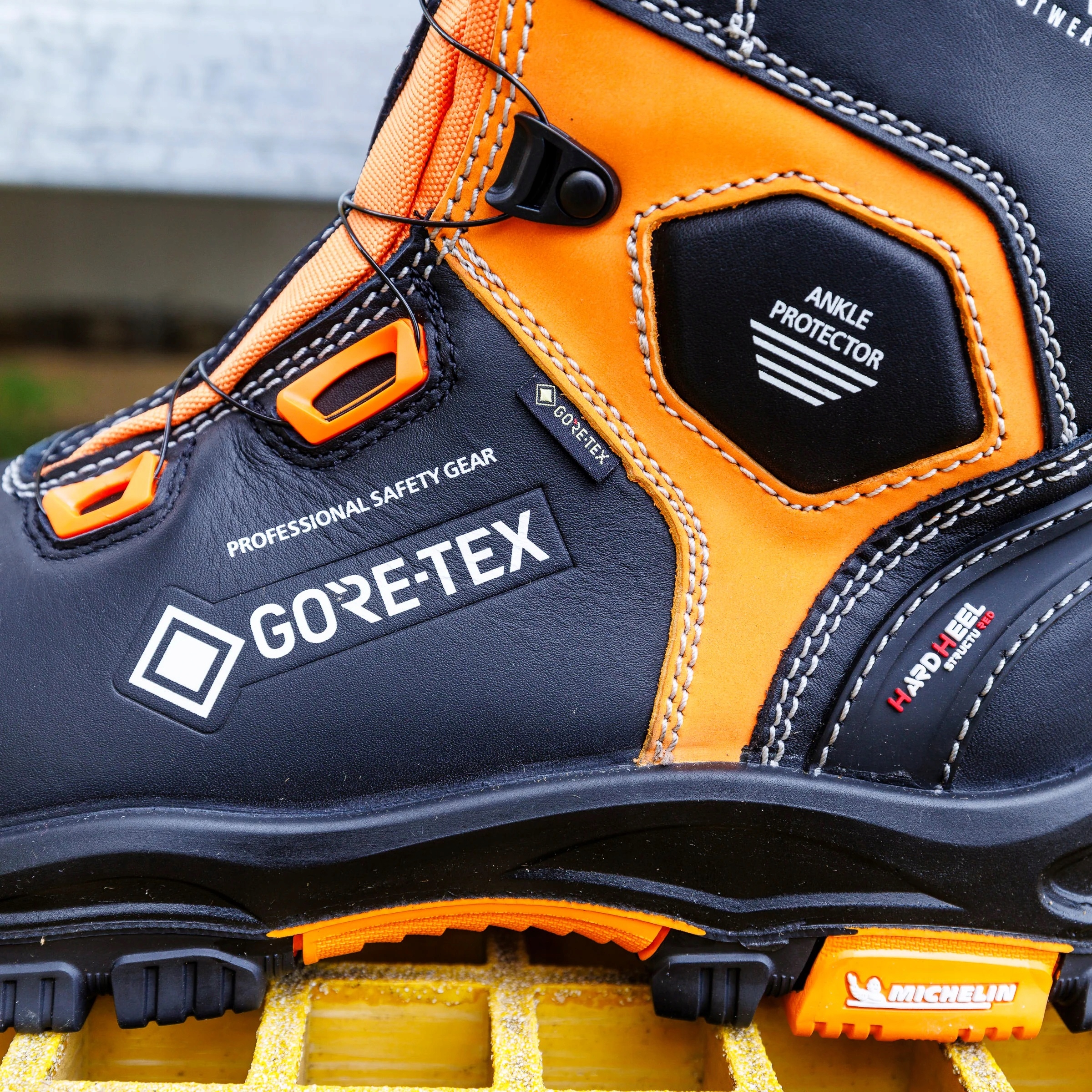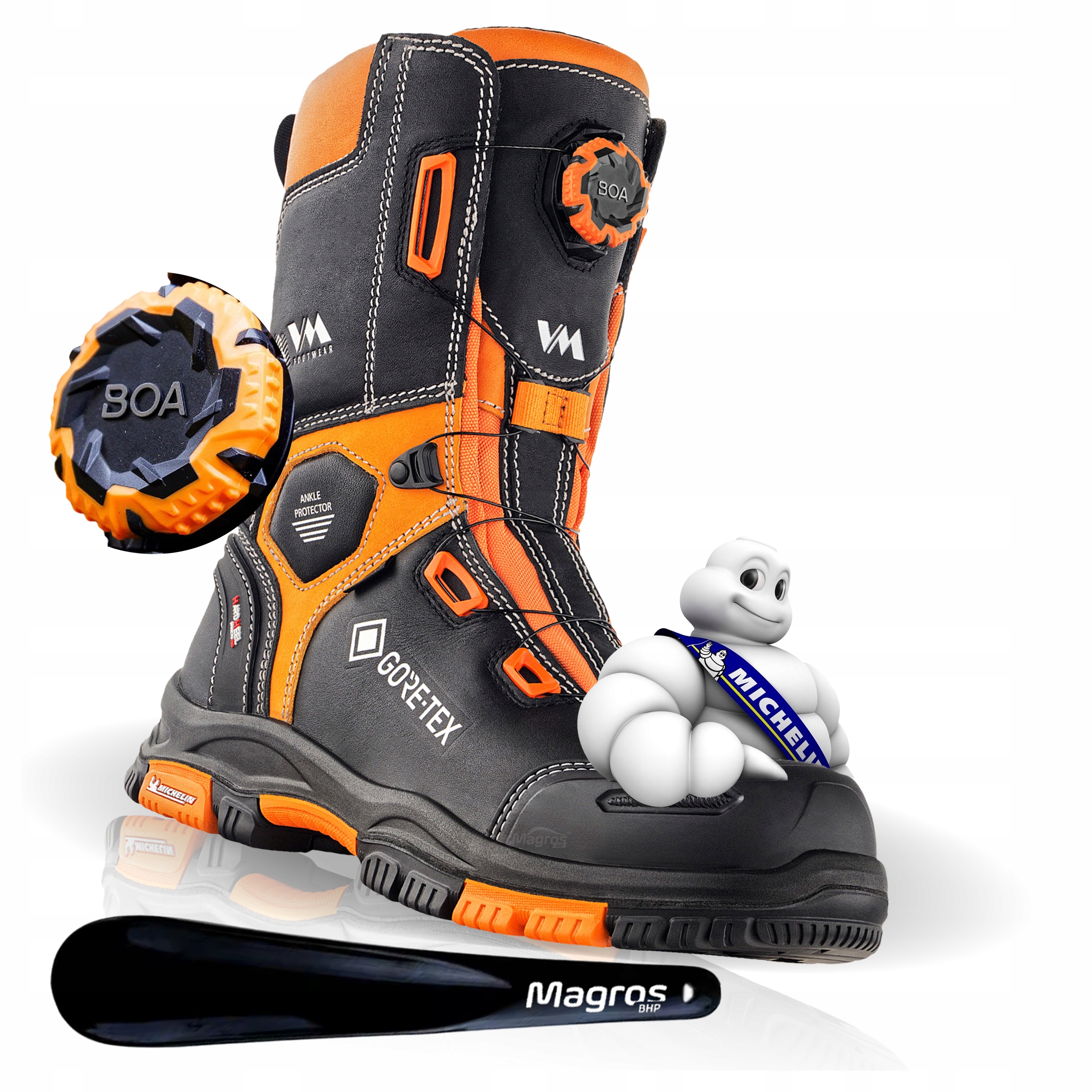 Високі захисні черевики з композитним підноском і кевларовою вставкою проти проникнення в підошву. Гідрофобна шкіра, мембрана GORE-TEX®, технологія BOA® Fit System, технічна підошва MICHELIN® VM FOOTWEAR CONNECTICUT S7L FO HRO AN SR BOA
