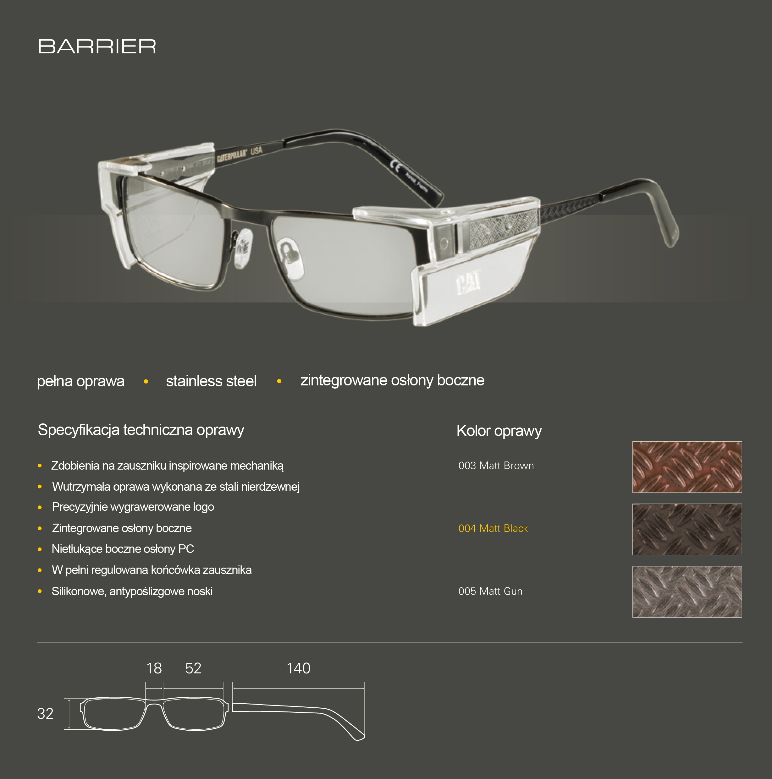 Оправи Cat гарантують оптимальний захист. Завдяки використанню полікарбонатних лінз вони забезпечують найвищий захист очей. Матеріали, з яких виготовлені рами, перевірені на стійкість до хімікатів, пилу та ударів.