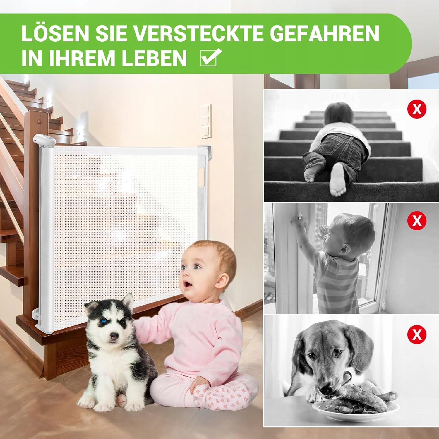 - Уникнення небезпечних місць для дітей: щоб дитина не відкривала газові печі, розетки, шафи та холодильники або підніматися по сходах, просто встановіть негабаритні двері для немовлят на кухні, вітальні або на сходах. Ваша дитина не зможе відкрити небезпечні газові печі, електричні розетки або відкриті шафи та холодильники.