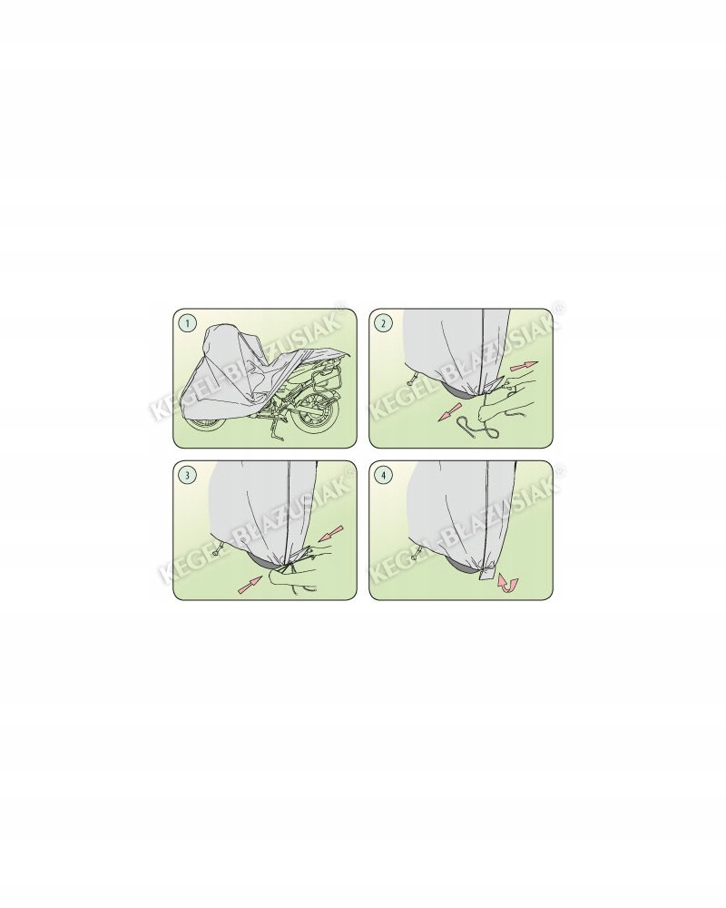 Чохли захистять весь мотоцикл і його нижню частину від шкідливого впливу навколишнього середовища. Вони стійкі до УФ-променів. Прикріплені за допомогою шнура навколо всього транспортного засобу, правильно зав’язані, вони забезпечують безпеку навіть під час поривчастого вітру. Завдяки широкому асортименту форм і розмірів чохли добре підходять для різних мотоциклів.